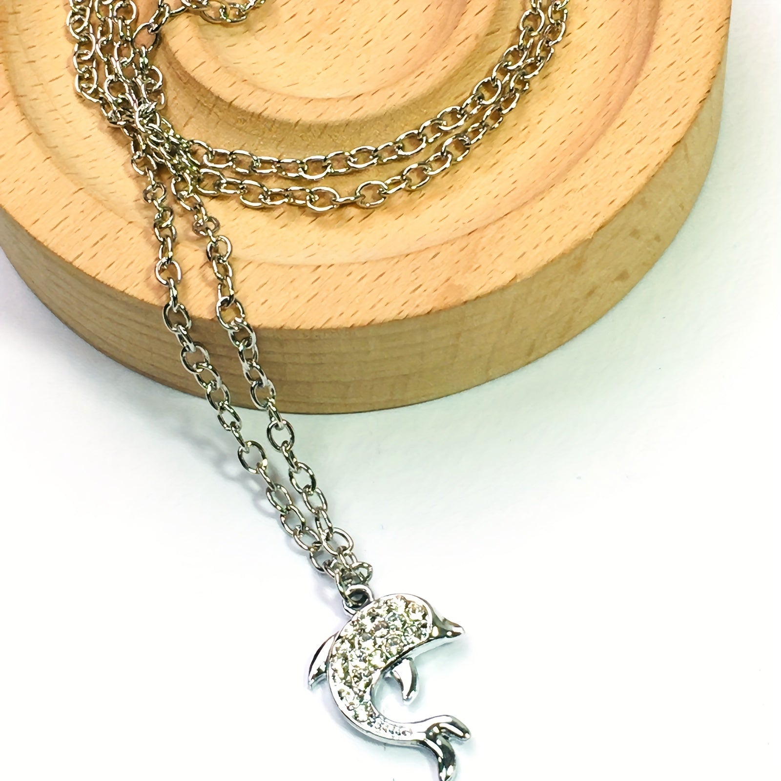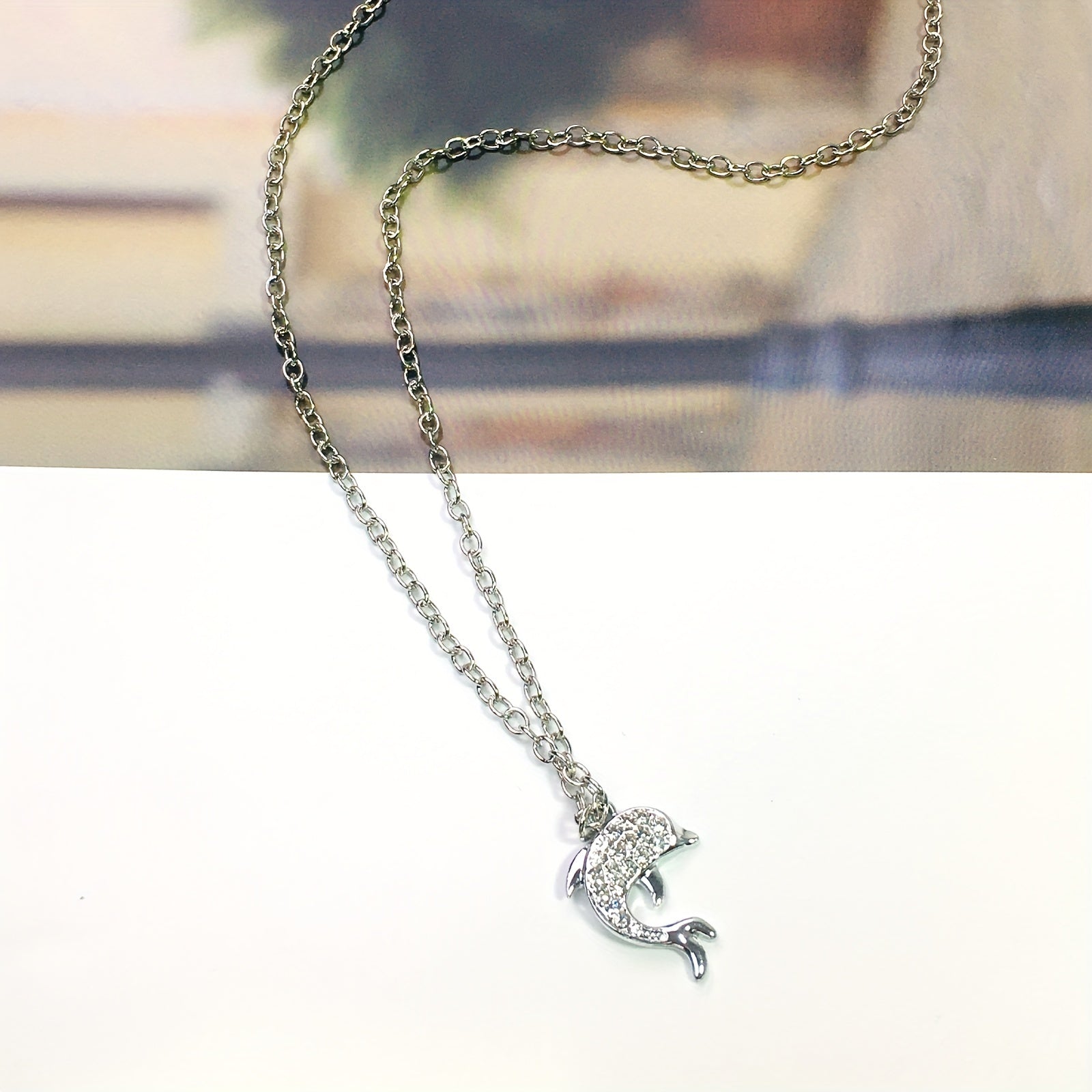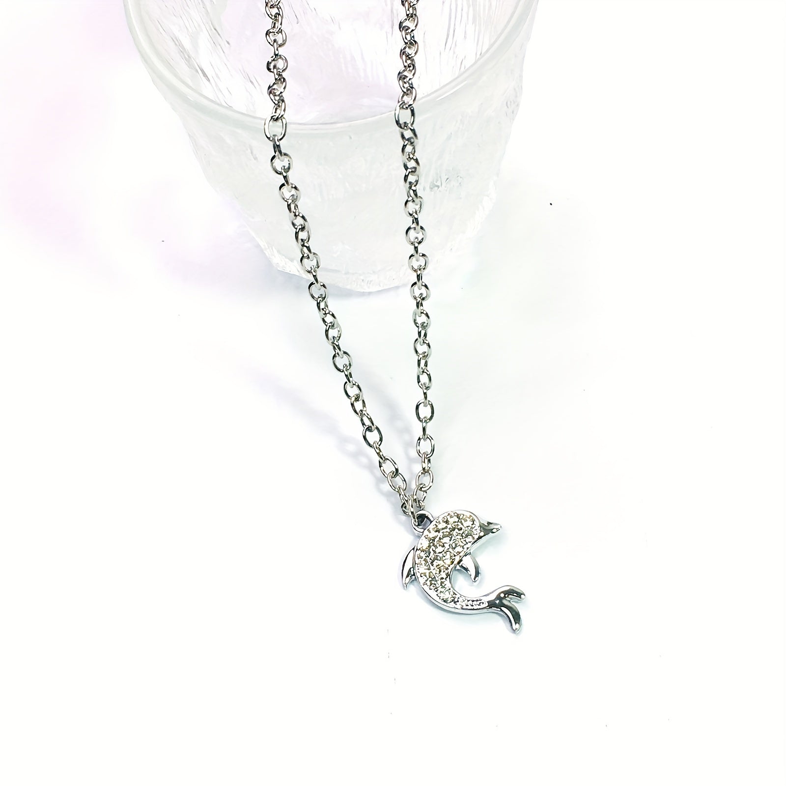 Exquisite dolphin shape pendant necklace with inlaid rhinestones, made from silver-tone alloy. Perfect accessory for both men and women.