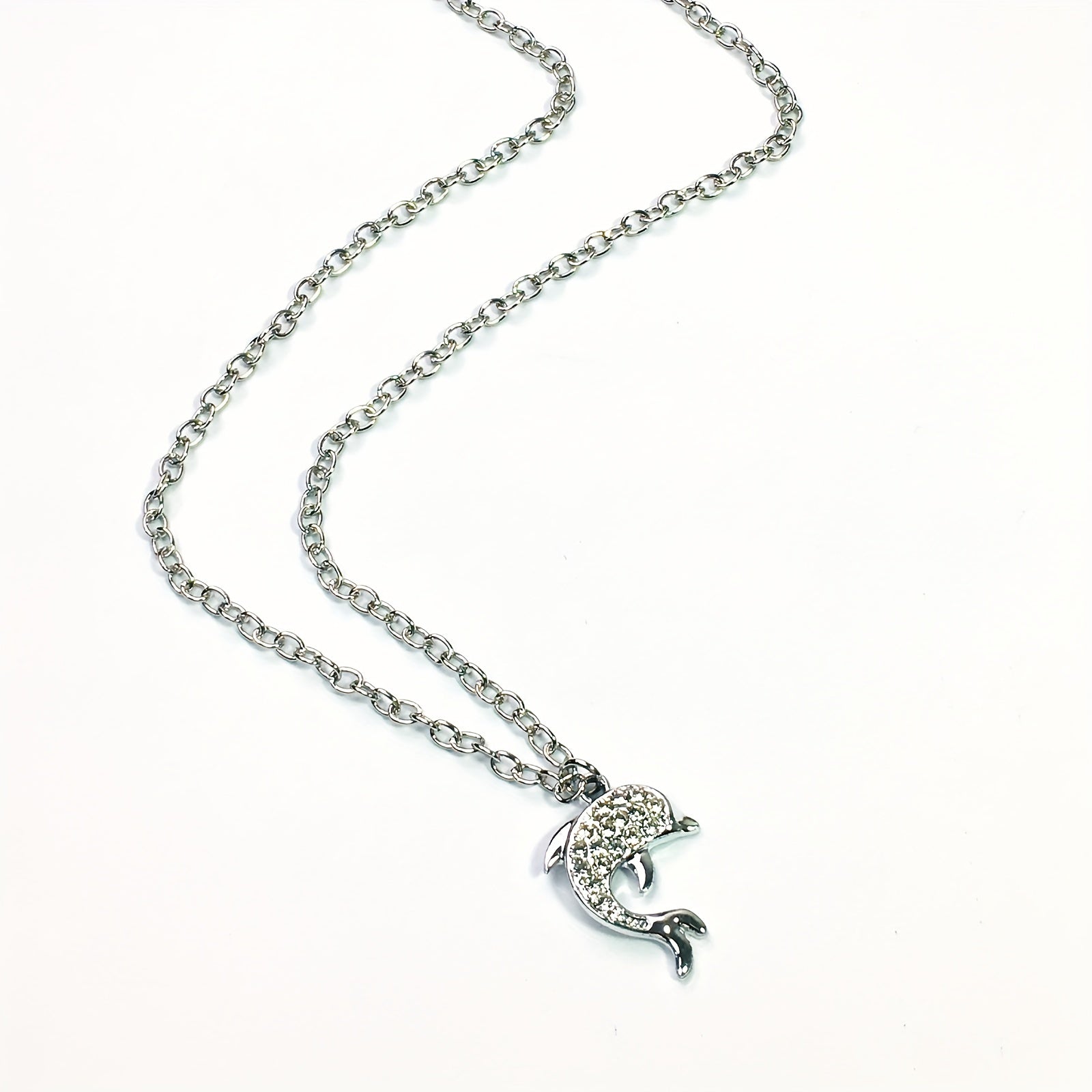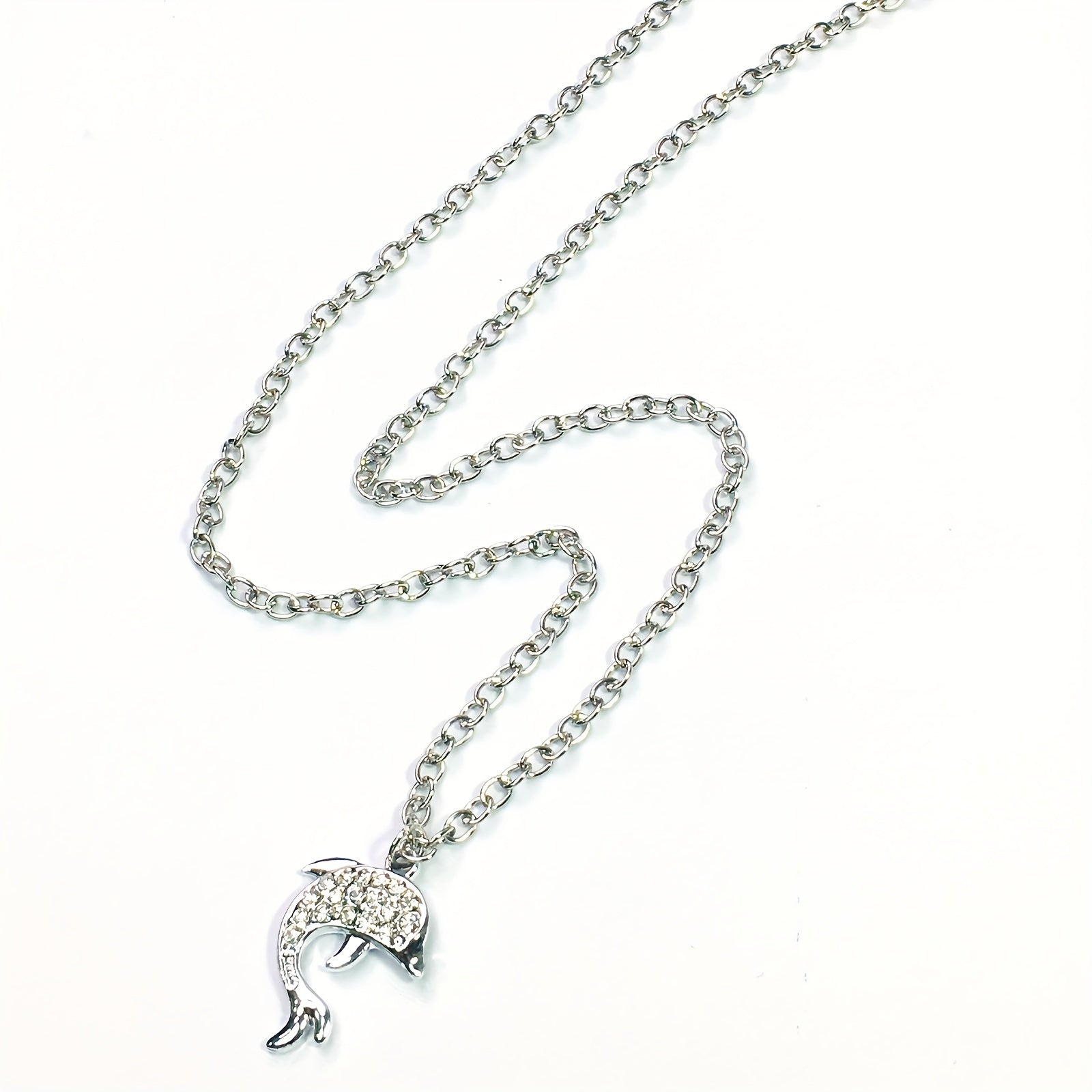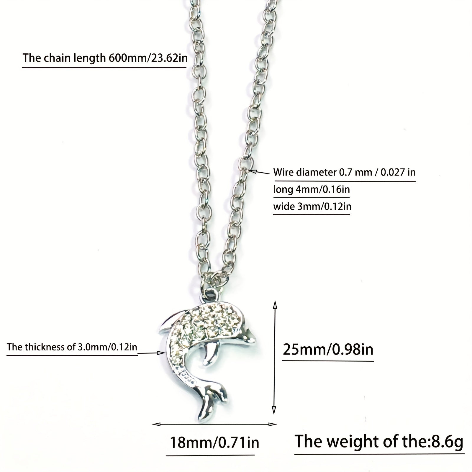 Exquisite dolphin shape pendant necklace with inlaid rhinestones, made from silver-tone alloy. Perfect accessory for both men and women.