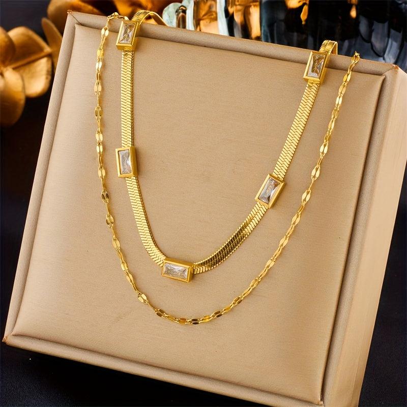 Elevate your style with this high-end European and American retro necklace featuring stacked collarbone chains and square synthetic gemstone accents.