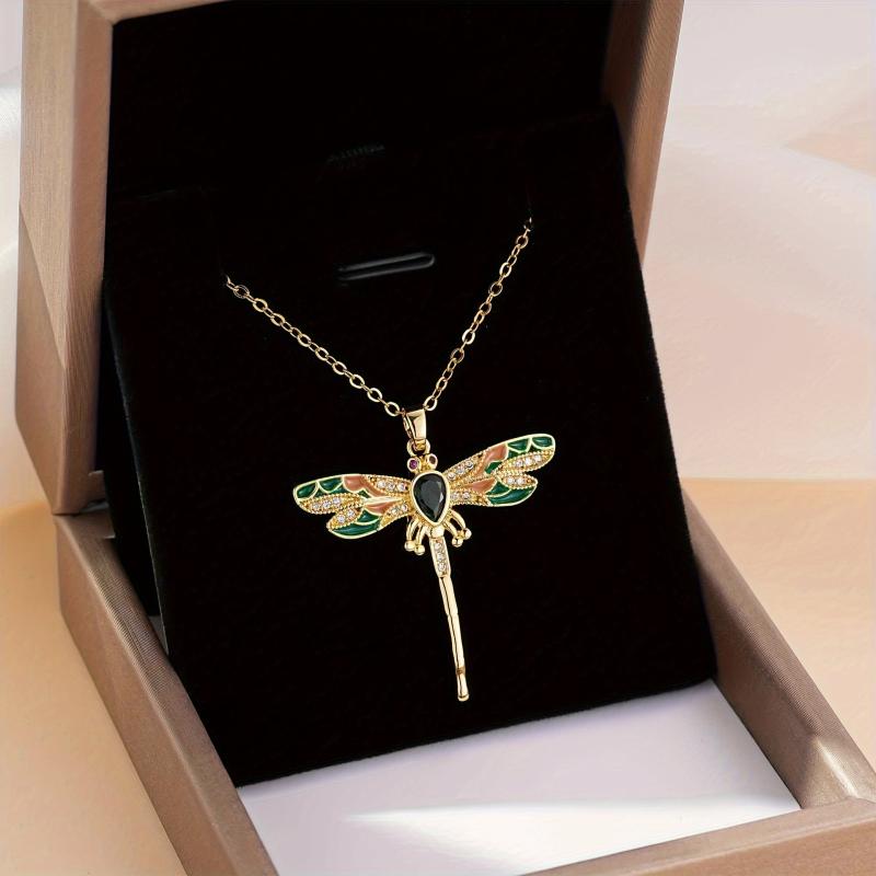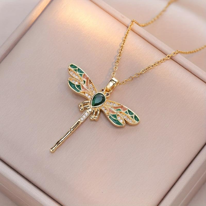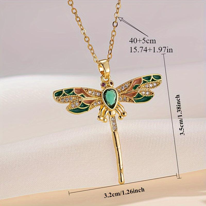 Elevate your style with this dragonfly pendant necklace featuring a stunning green synthetic zirconia set on a sleek collar chain. Perfect for vacation parties.
