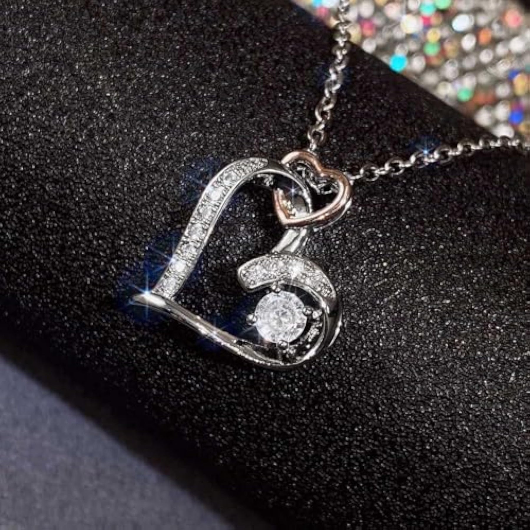 This elegant necklace features a dual heart connected pendant with zirconia pave, perfect for adding a touch of glamour to any outfit. It comes with a plated chain for a beautiful finish.