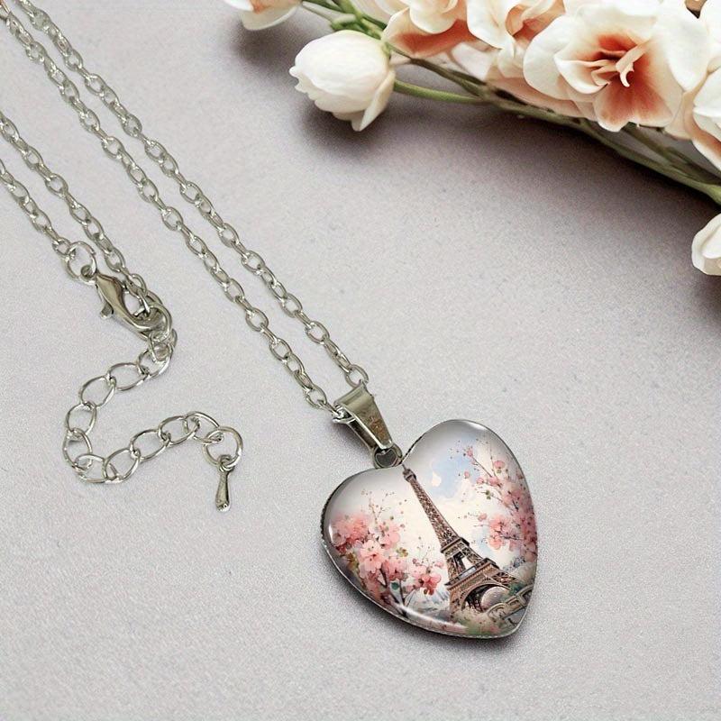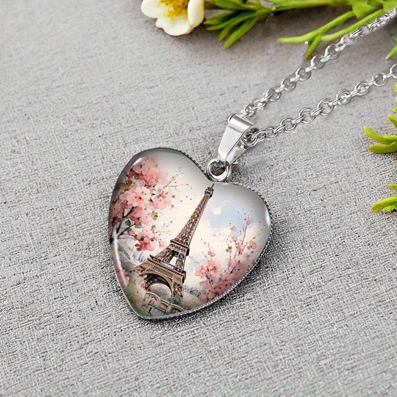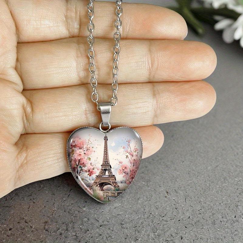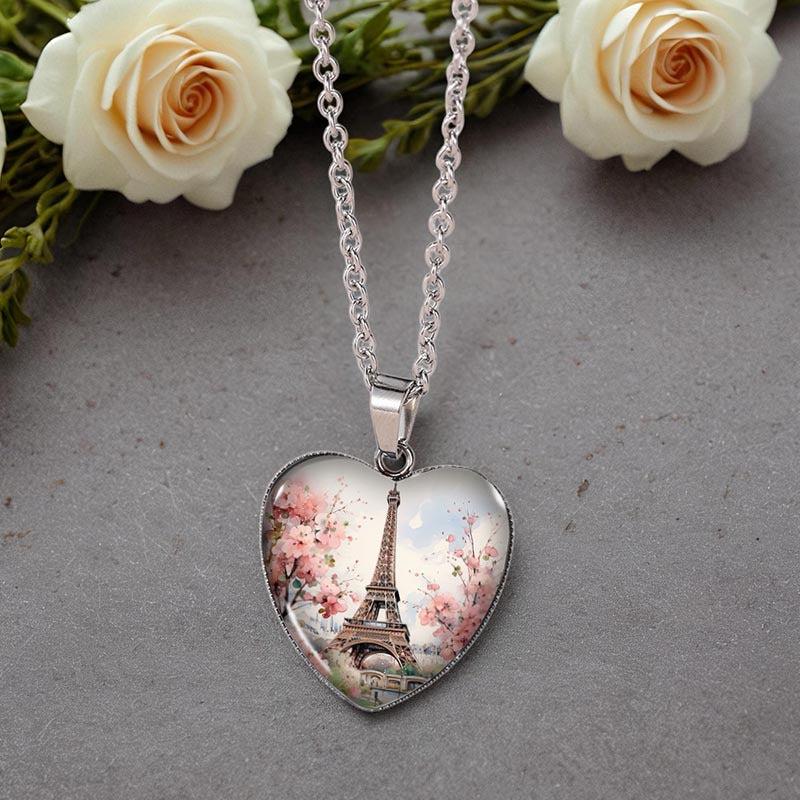 This pendant necklace features a spring-themed design with a heart-shaped glass pendant depicting the Eiffel Tower. It is a stylish accessory for men's jewelry.