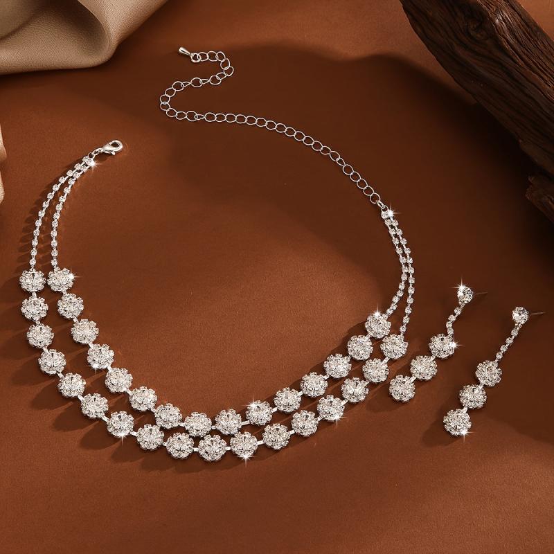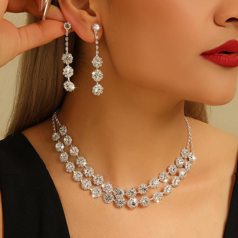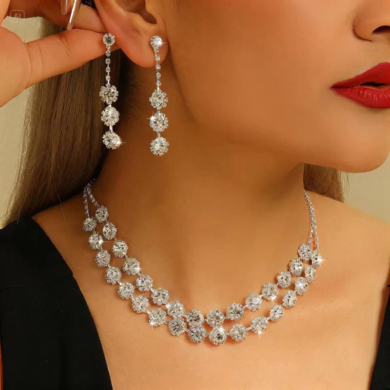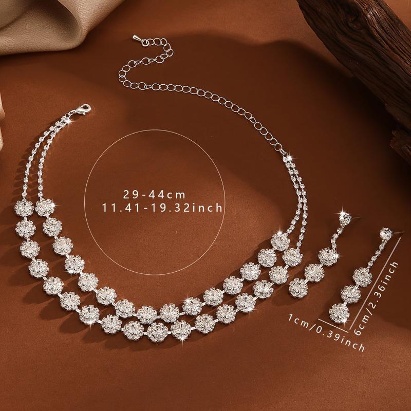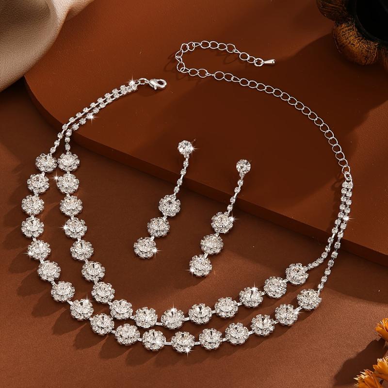 This stunning jewelry set includes a water drill double layer copper necklace full inlaid with rhinestones. Perfect for brides, wedding parties, banquets, or any special occasion.