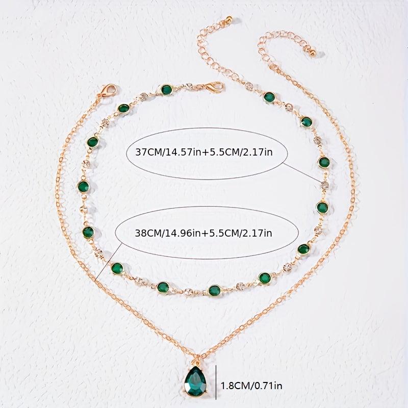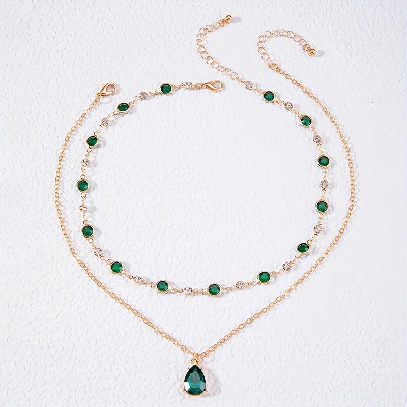 Elegant double layer necklace with emerald green gemstone and teardrop pendant on golden tone chains. Perfect for daily wear and special occasions.