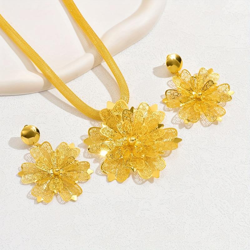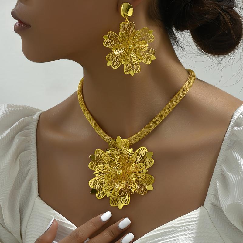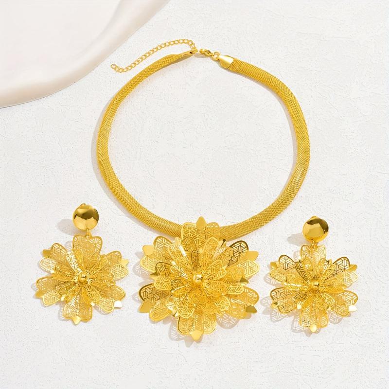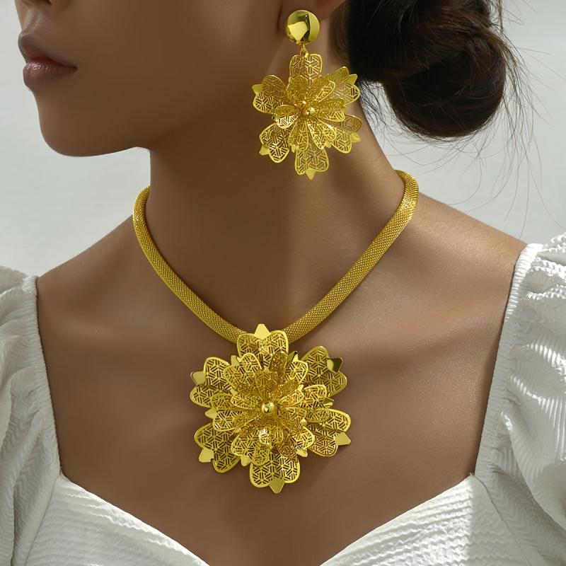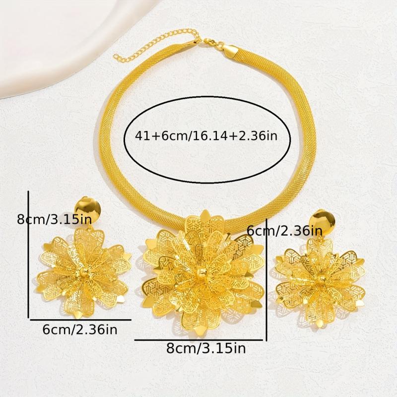 This three-piece jewelry set features a gorgeous and exaggerated design inspired by European and American light styles. It includes a petal hollow flower necklace and coordinating earrings, perfect for brides.