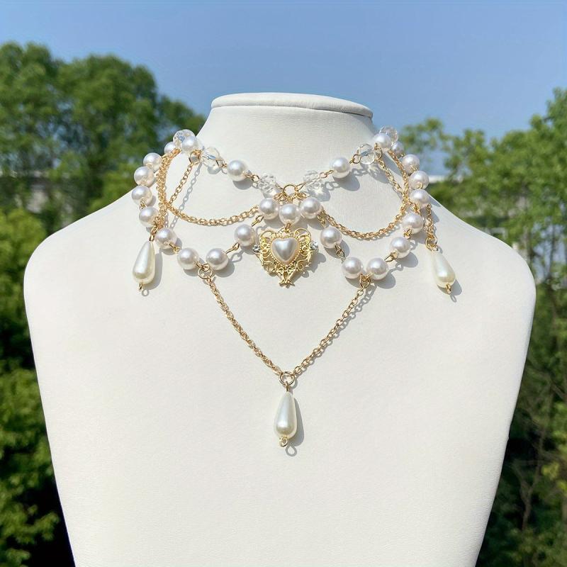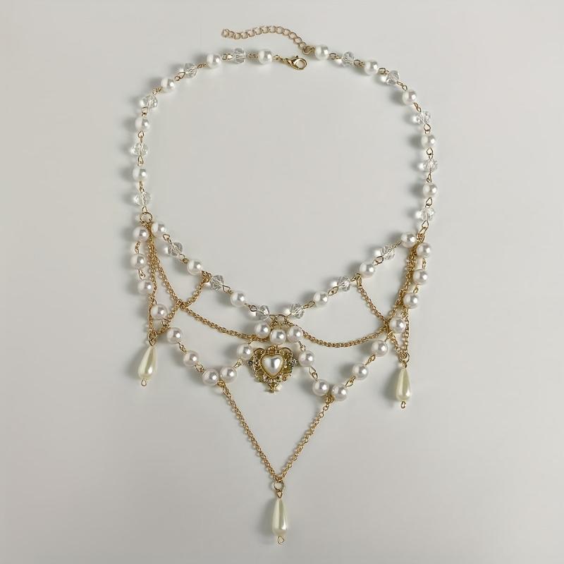 Elegant Y2K-style necklace with faux pearls, tassel, crystal, and hollow metal drop pendant.
