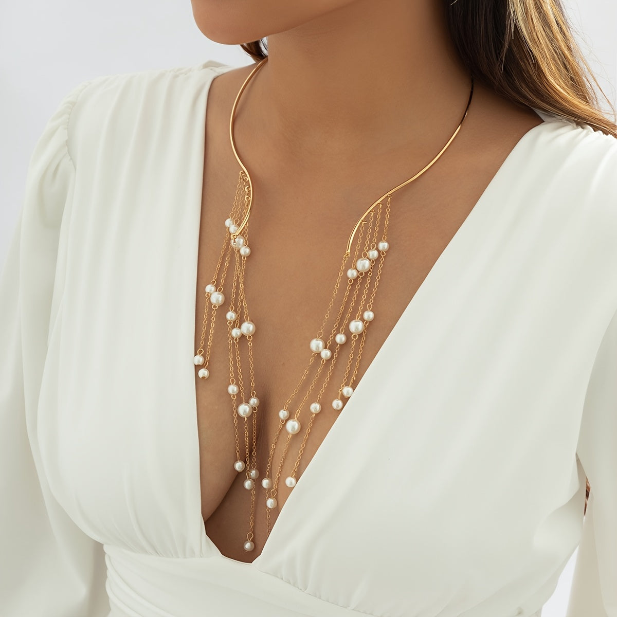 Elevate your style with this stunning open choker necklace featuring faux pearl tassel design. A perfect accessory for women and girls. Ideal as a gift.