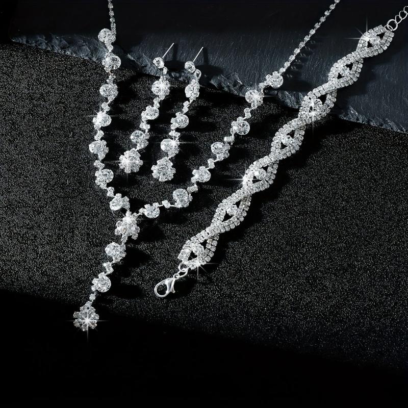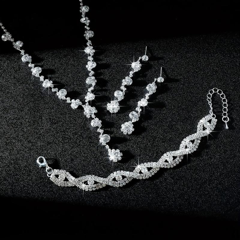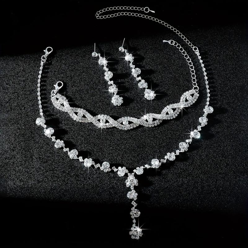 This stunning three-piece set includes a necklace, earrings, and bracelet adorned with rhinestone flowers. Perfect for weddings and banquets.