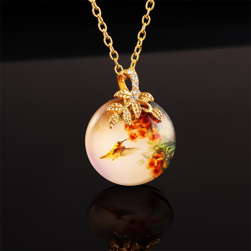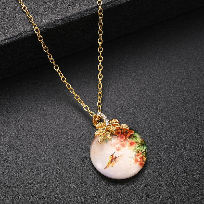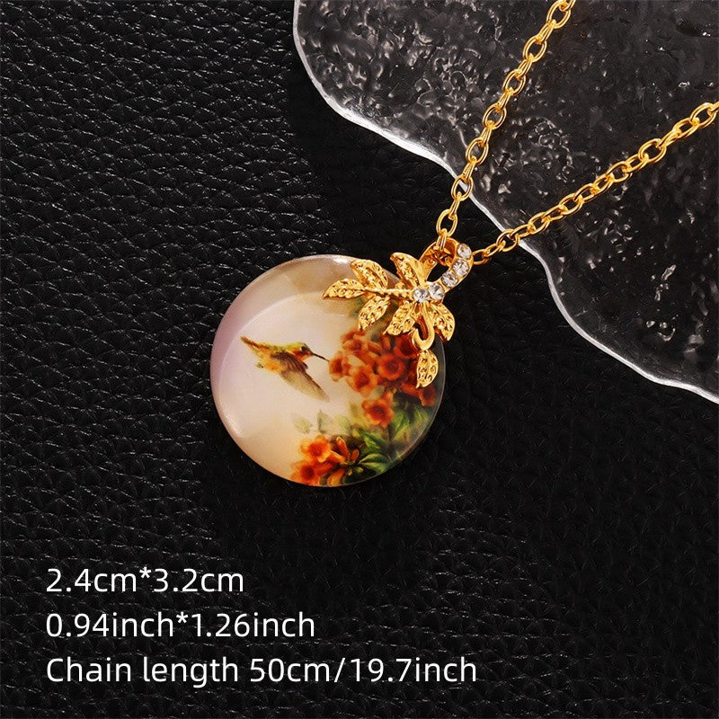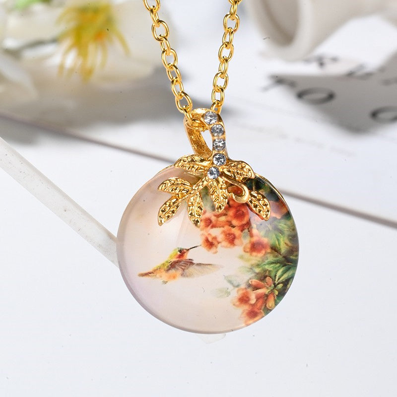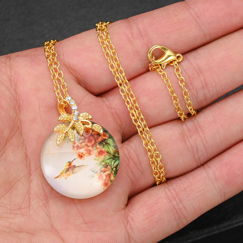 Beautiful round glass pendant necklace featuring a flower and bird design.