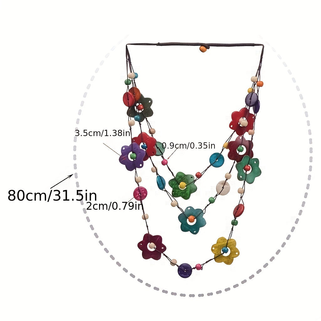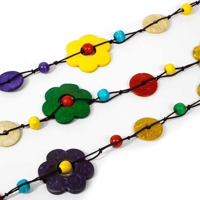 Add a touch of nature-inspired charm to your outfit with this flower pendant necklace featuring colorful wooden beads and coconut shell beads. Perfect for women and girls.
