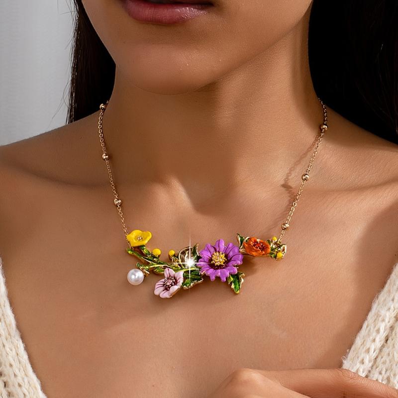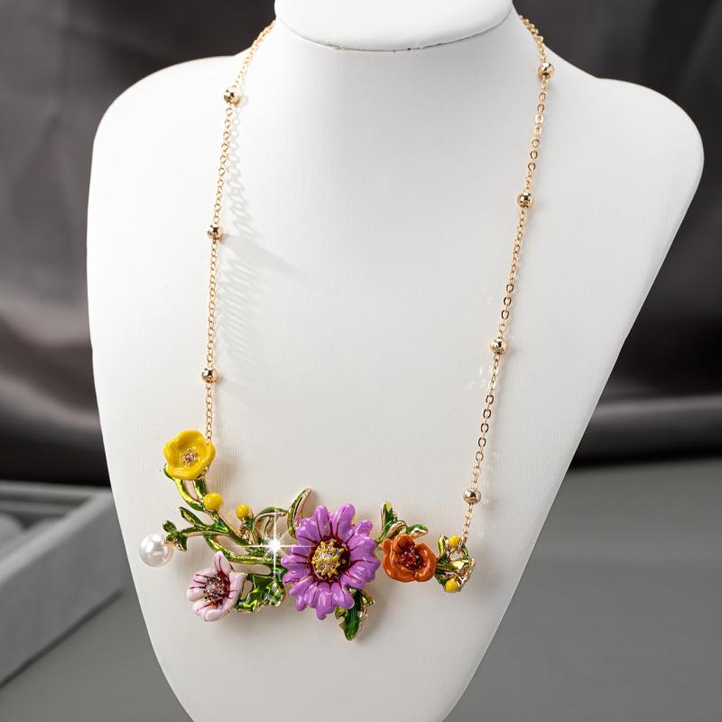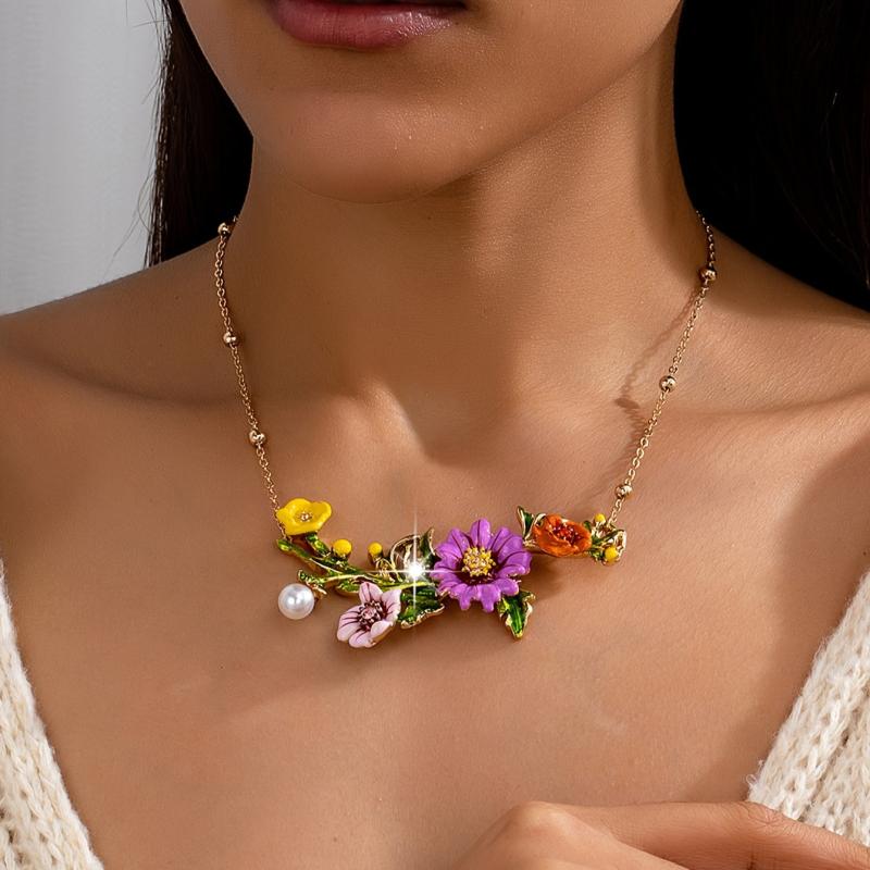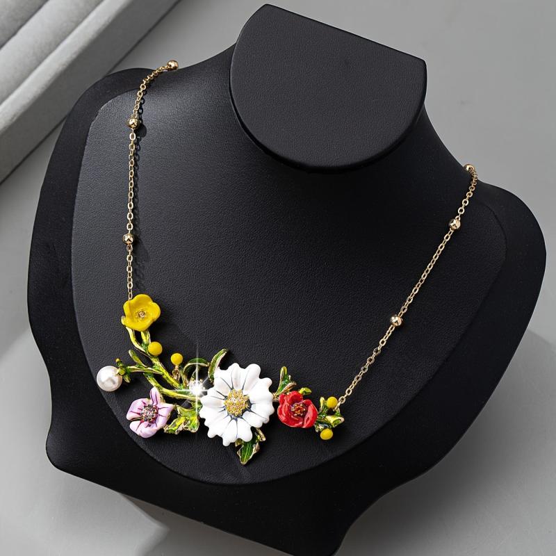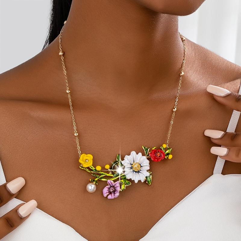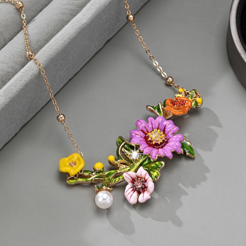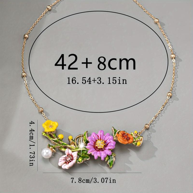Add a touch of elegance to your outfit with this French floral enamel pendant necklace. The necklace is made of 18K golden plated zinc alloy and adorned with multicolor glass flowers, perfect for everyday wear or special occasions like birthdays and dates.