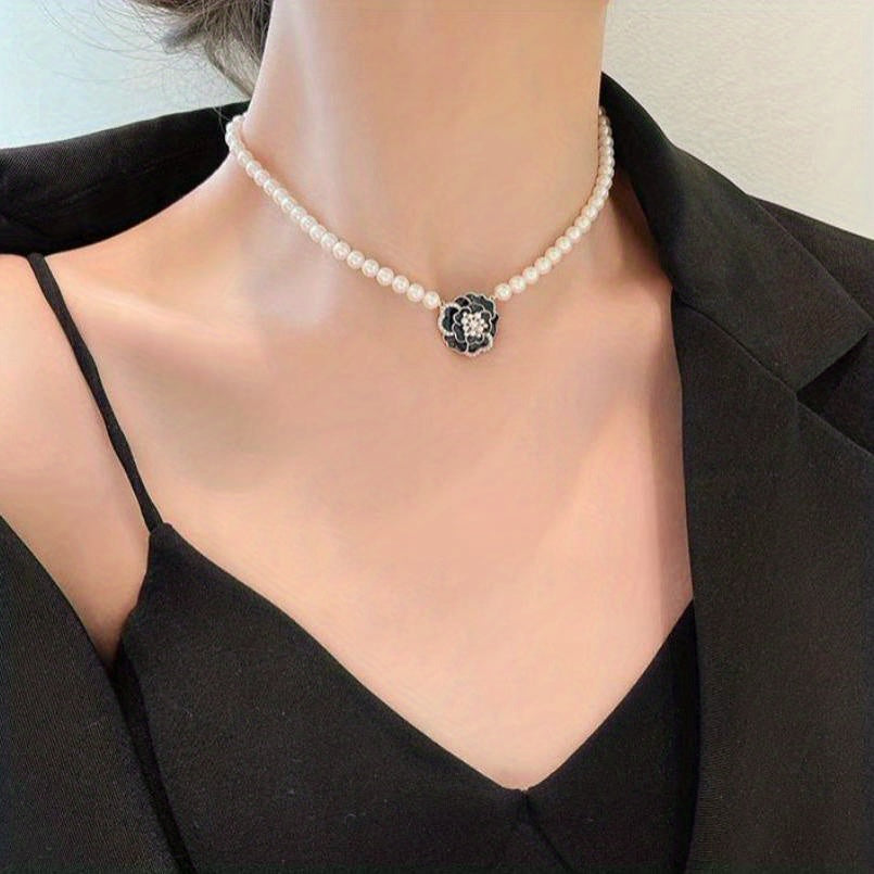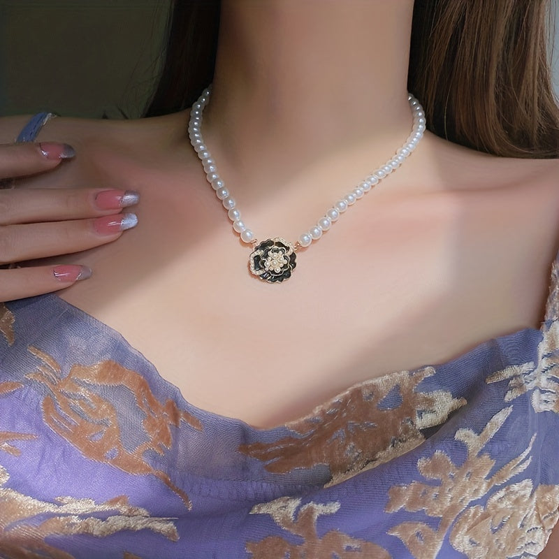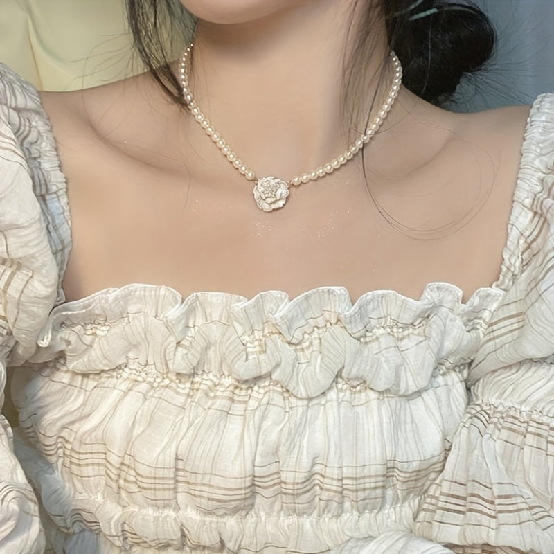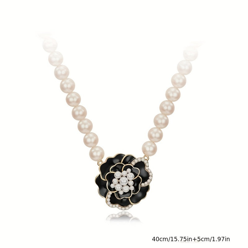 Elegant and timeless pendant necklace featuring a camellia design with faux pearls. Perfect for women and girls who appreciate vintage French style.
