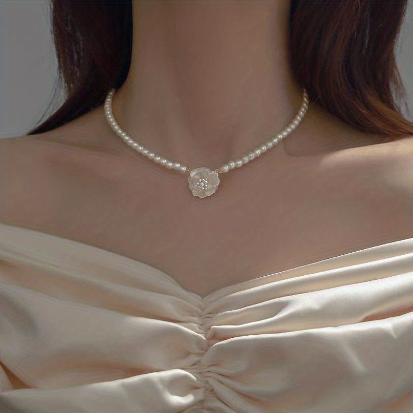 French Vintage Camellia Faux Pearl Pendant Necklace Clavicle Chain