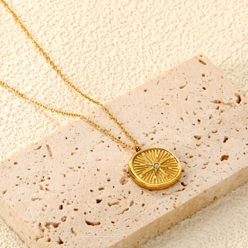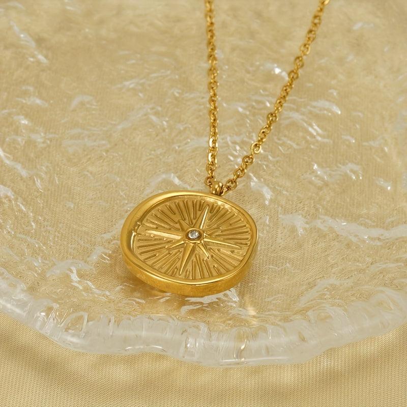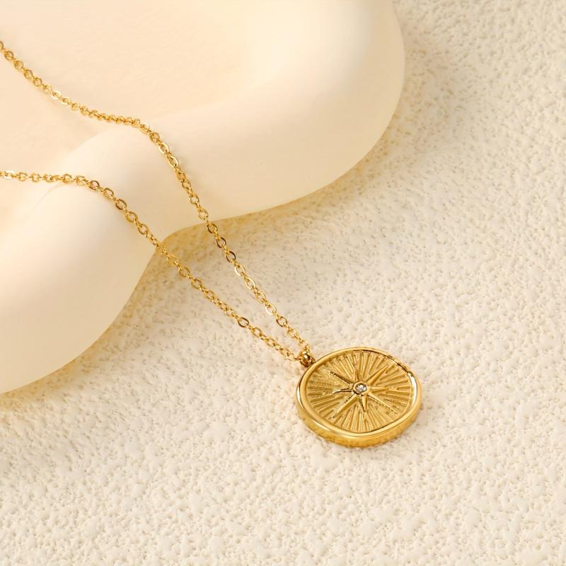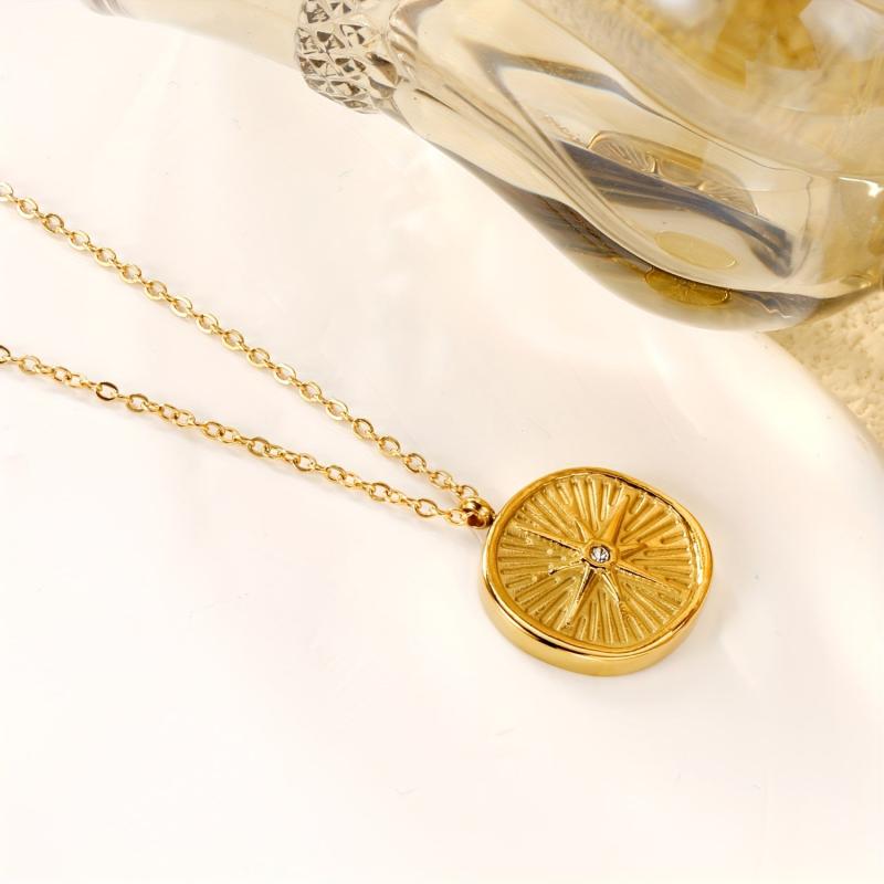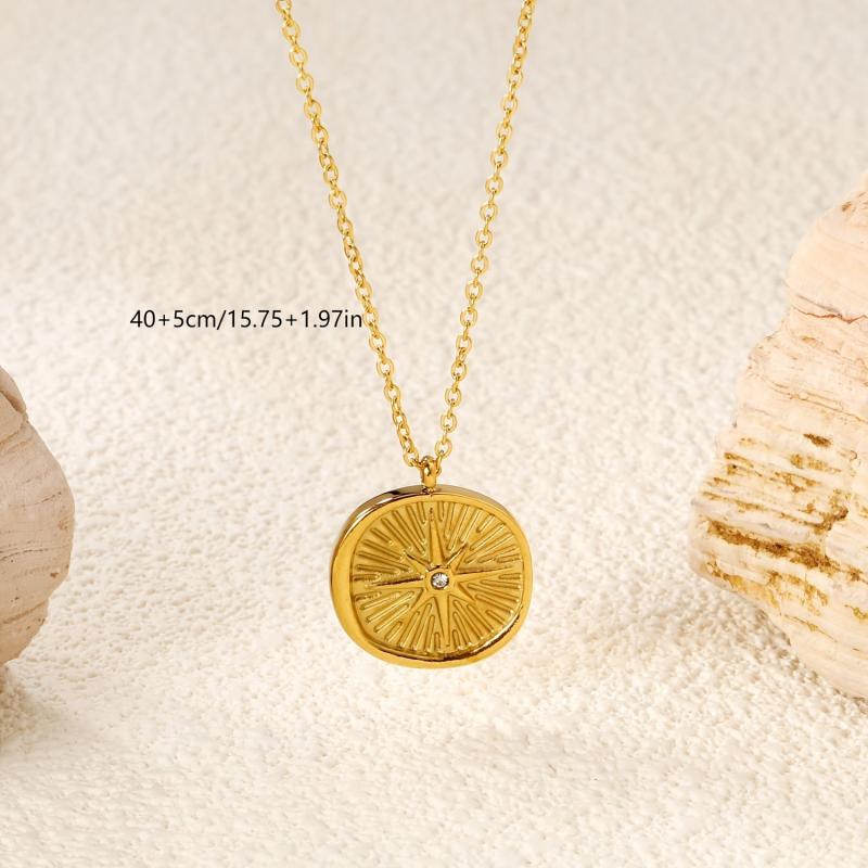 This French vintage compass pendant necklace features an elegant eight-pointed star design. Crafted from stainless steel, it exudes a classic and timeless charm.