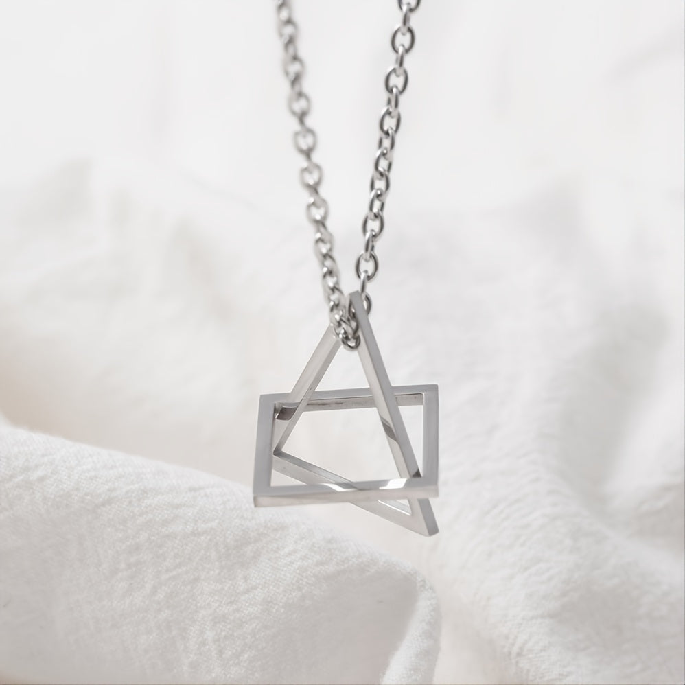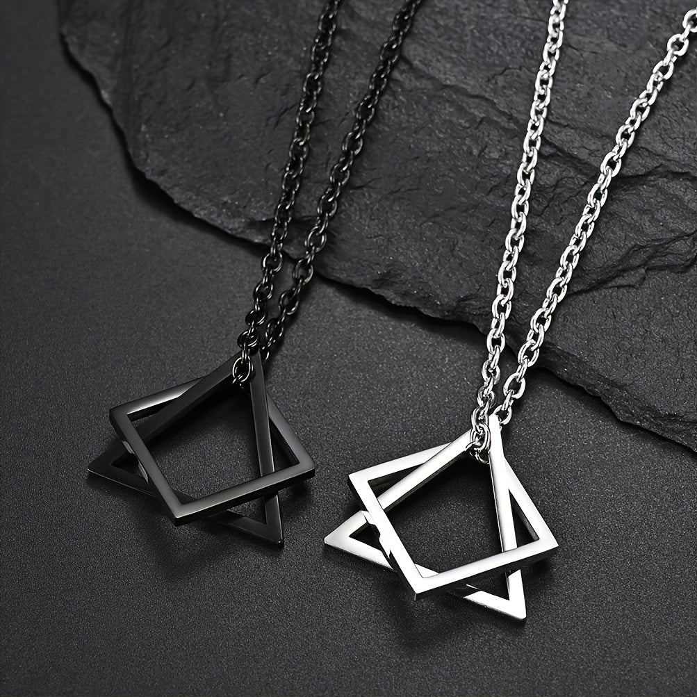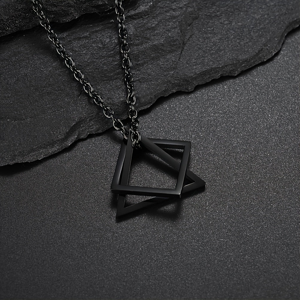 This stylish pendant necklace features an interlocking design of squares and triangles, perfect for men who appreciate geometric patterns. The necklace is crafted in silver for a sleek and modern look.
