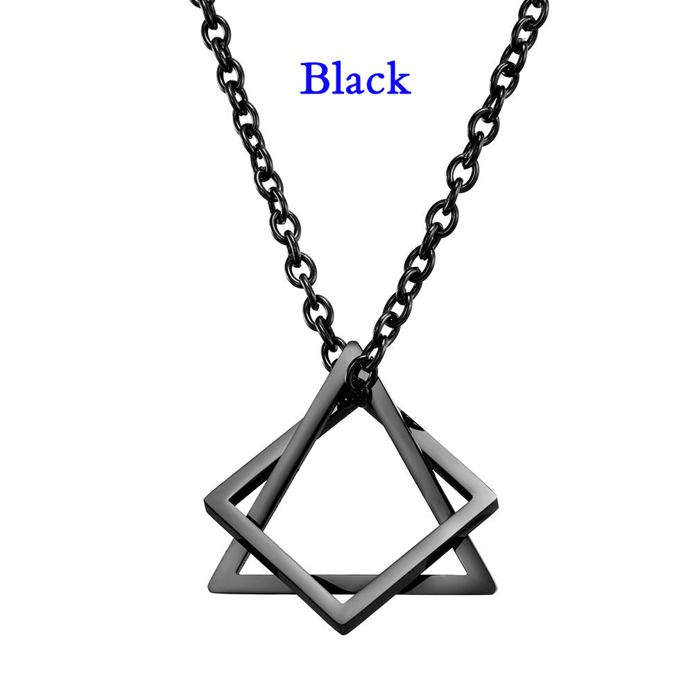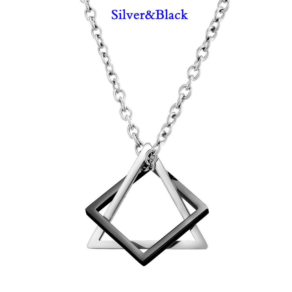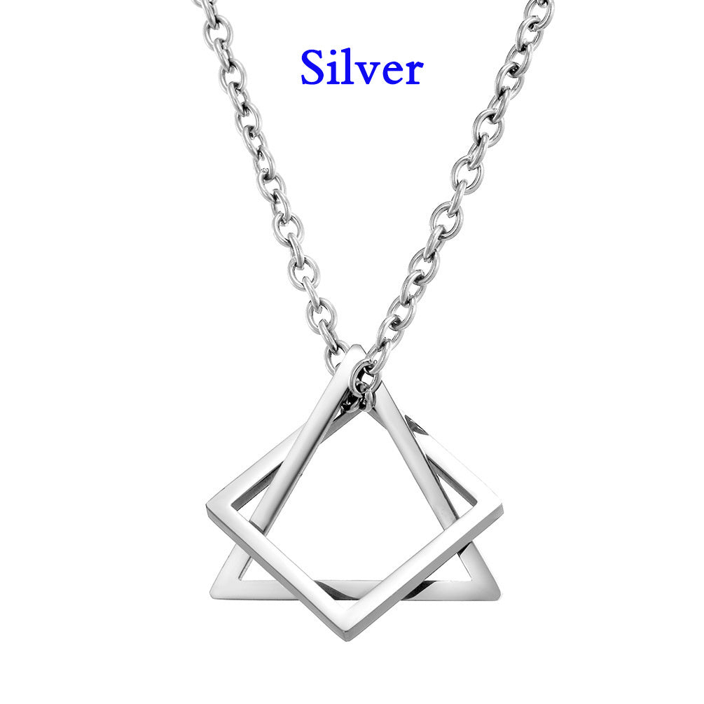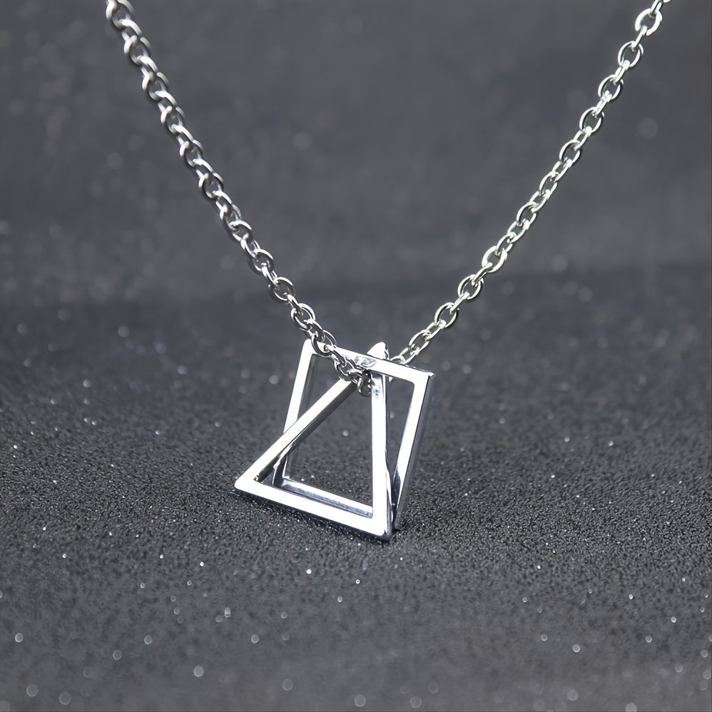 This stylish pendant necklace features an interlocking design of squares and triangles, perfect for men who appreciate geometric patterns. The necklace is crafted in silver for a sleek and modern look.