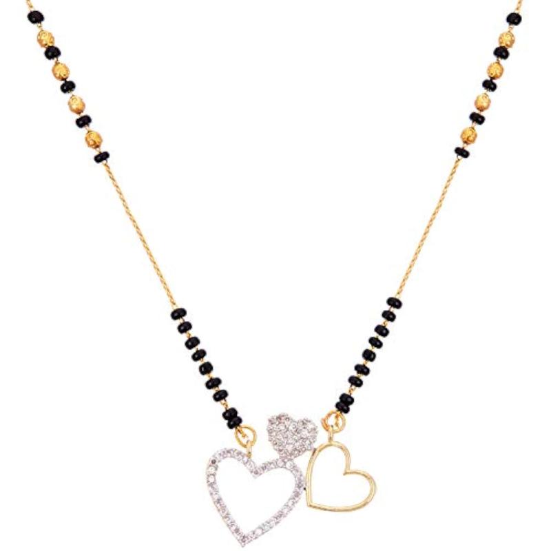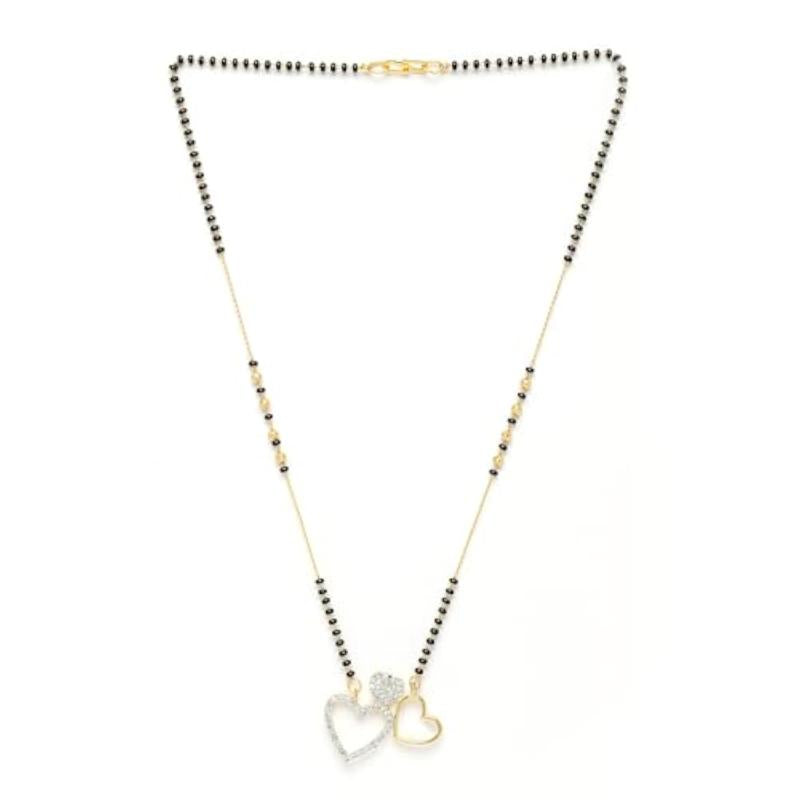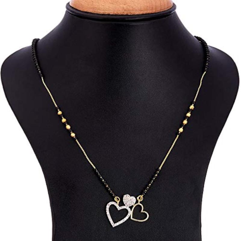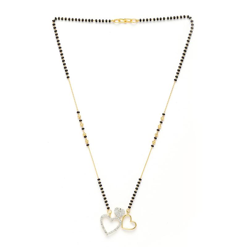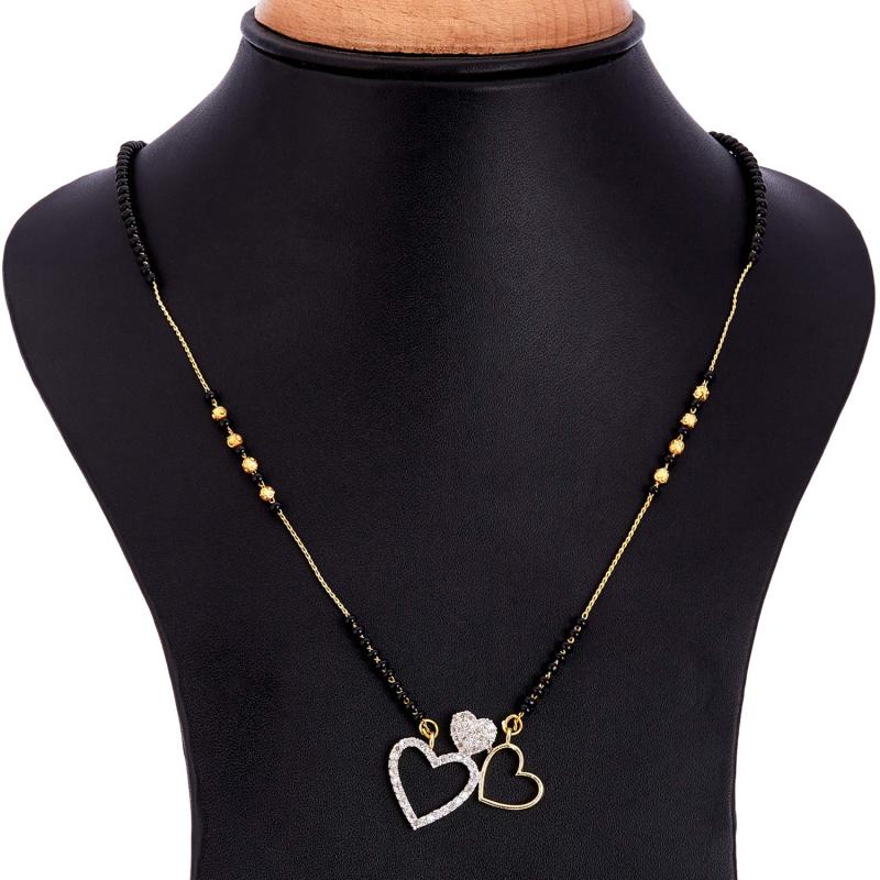 Elegant tanmaniya nallapusalu featuring 3 heart-shaped American diamond studded pendants on a gold-plated chain.