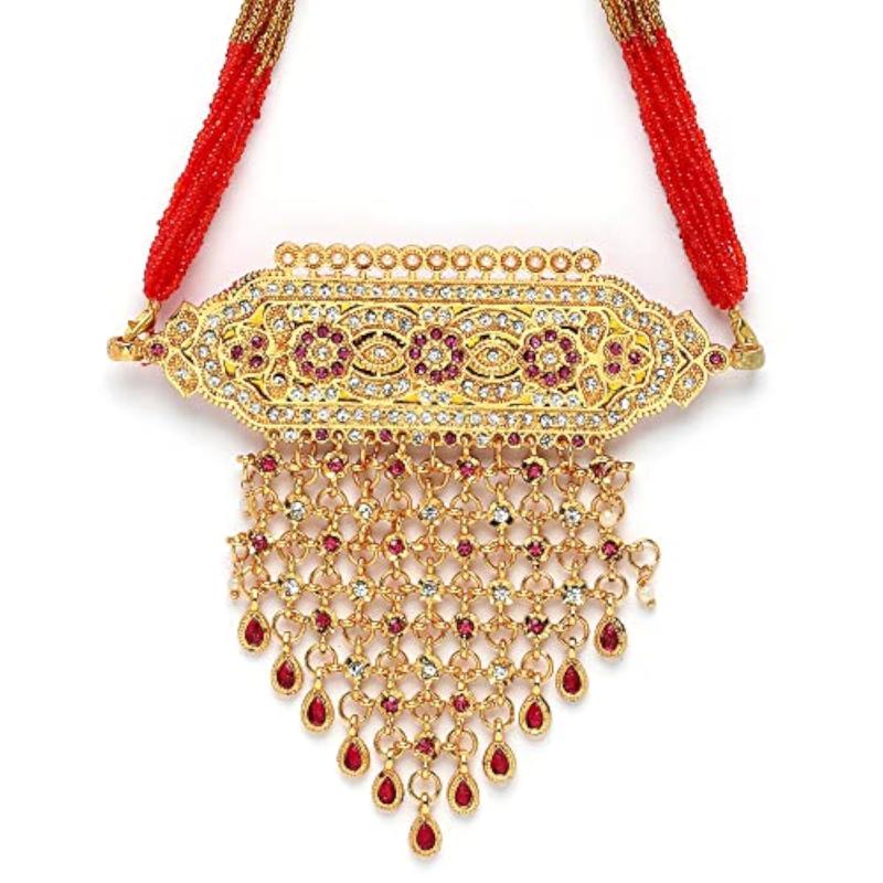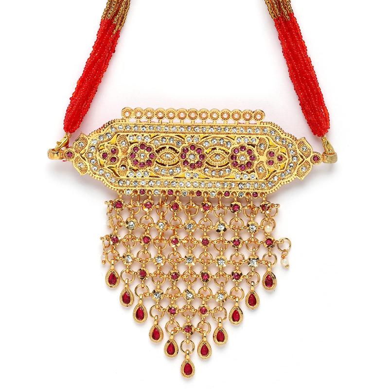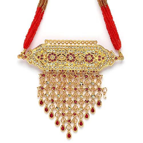Elegant gold-plated choker necklace with pink beads and kundan studs for a luxurious look.