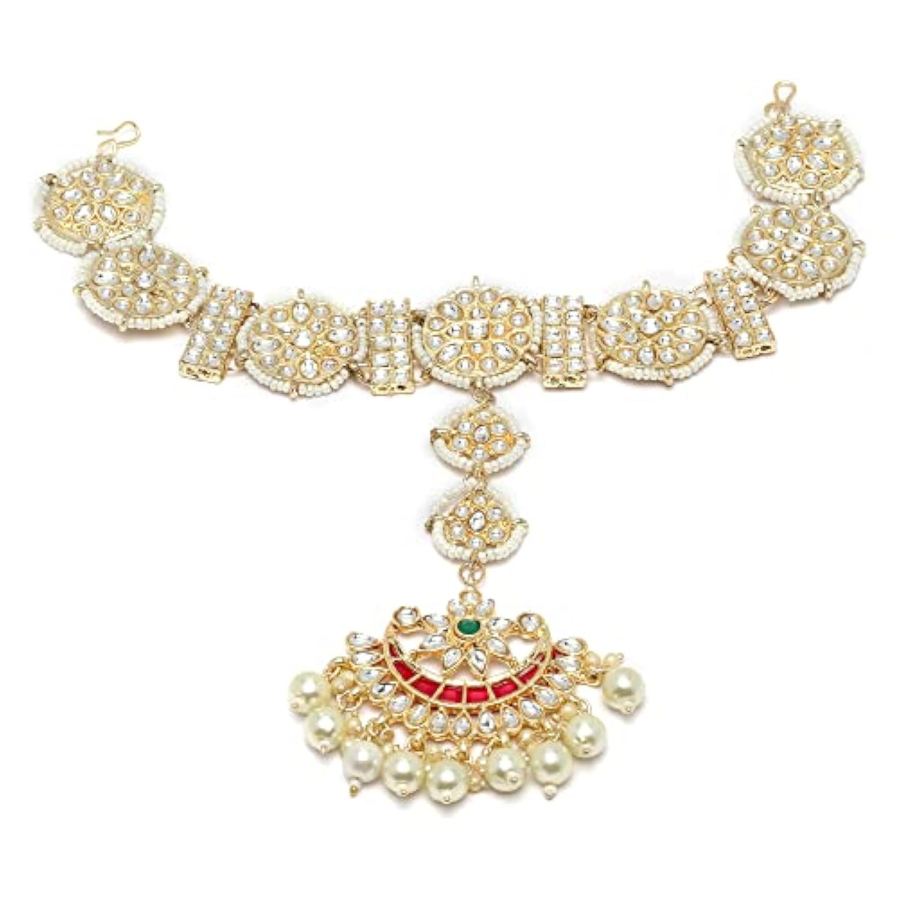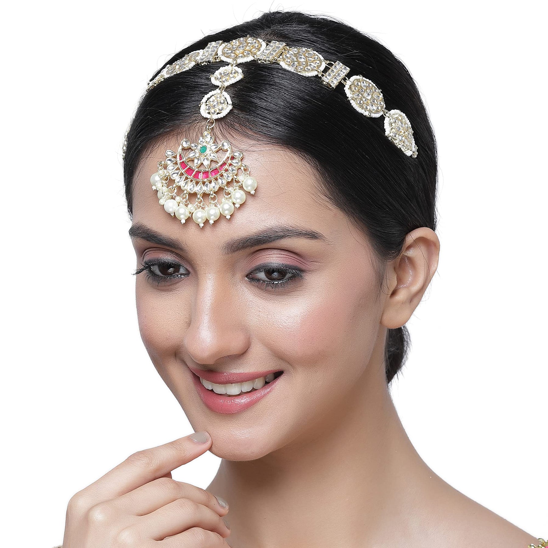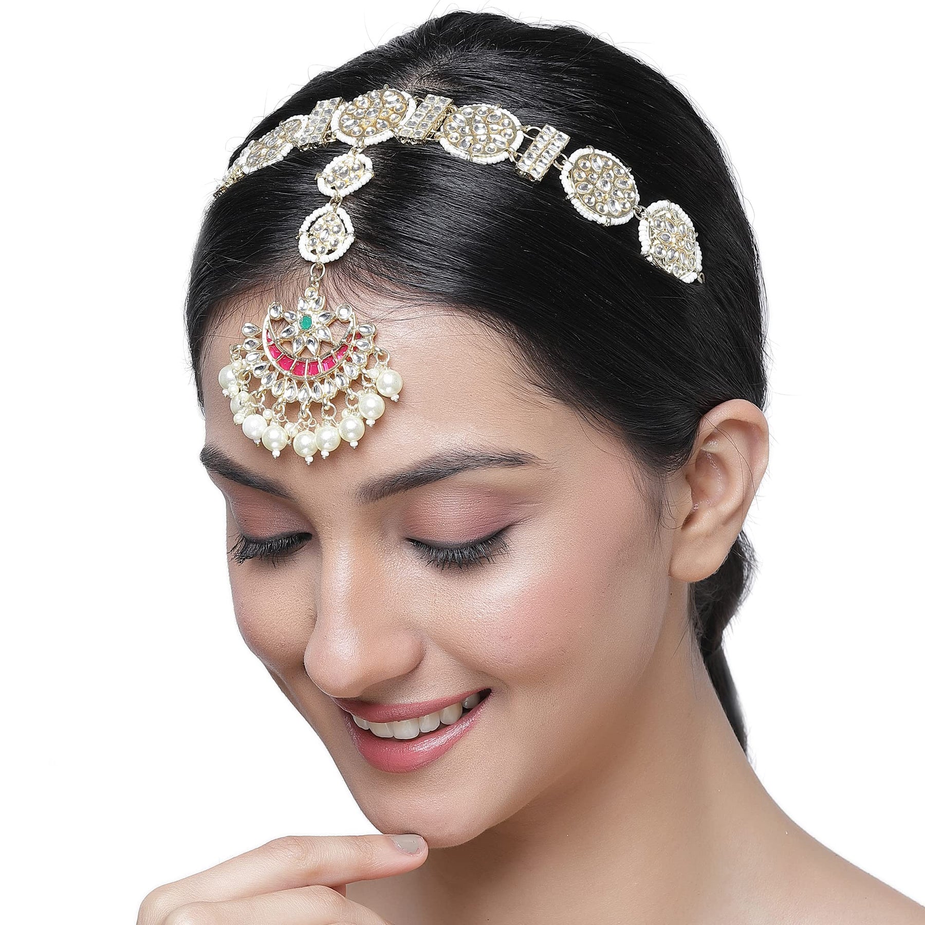 Exquisite borla sheeshphool featuring kundan studded crescent design with intricate details.