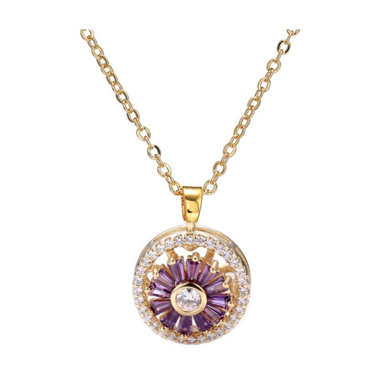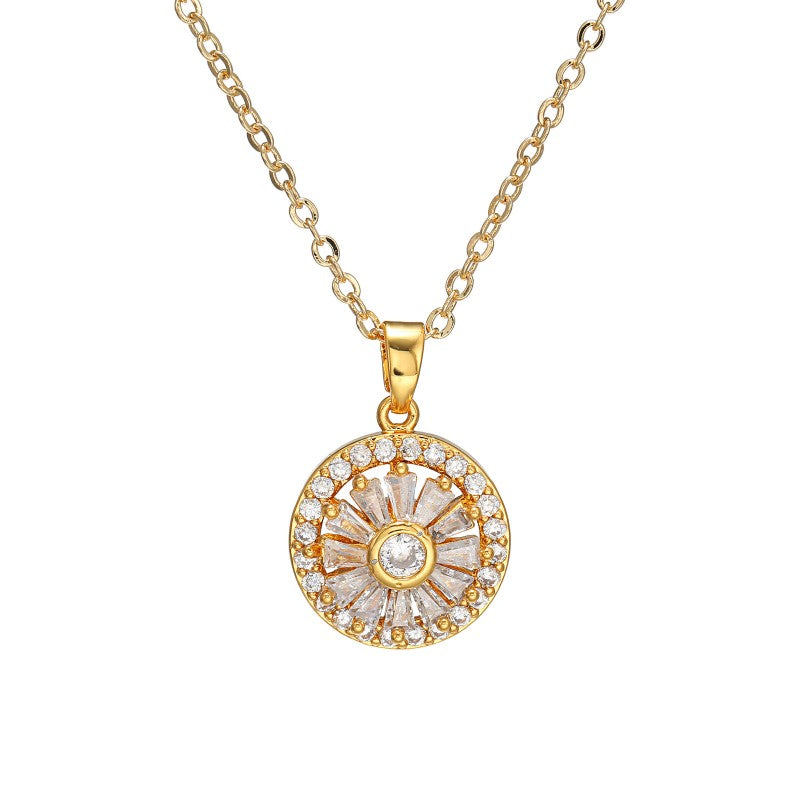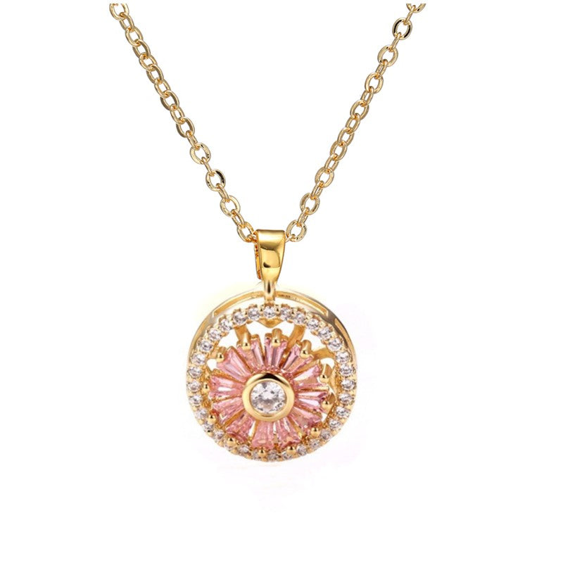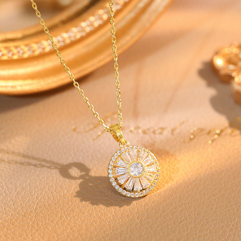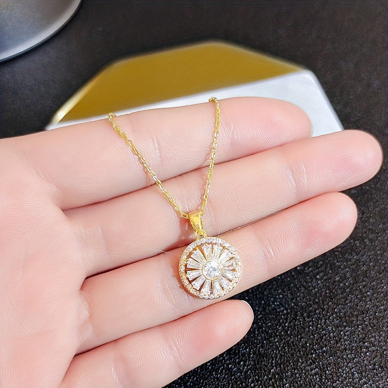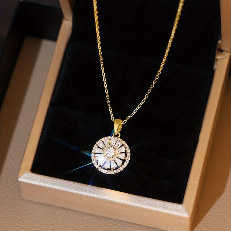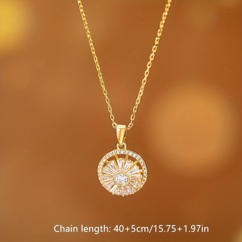Elegant necklace with 18K golden plating, rotating pendant, and zirconia inlaid design. Made of durable stainless steel.