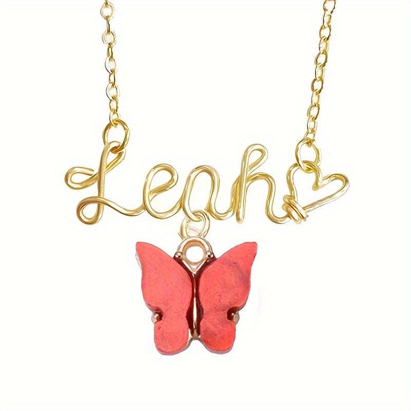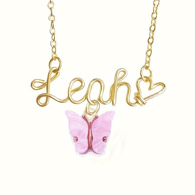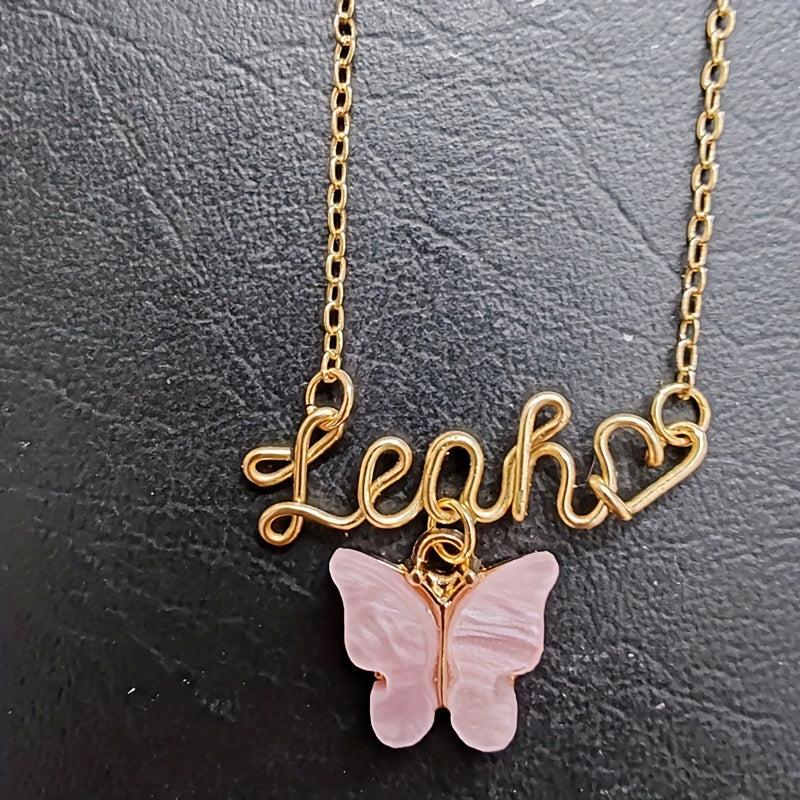 Charming butterfly necklace featuring pink enamel wings on a golden tone chain.