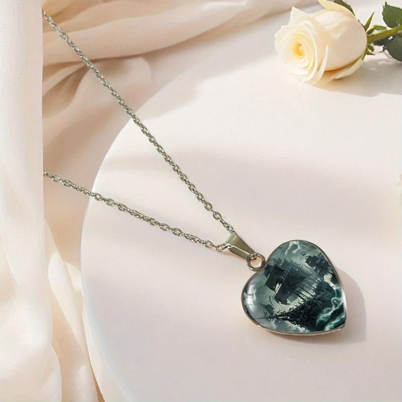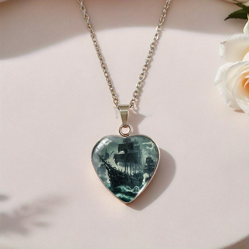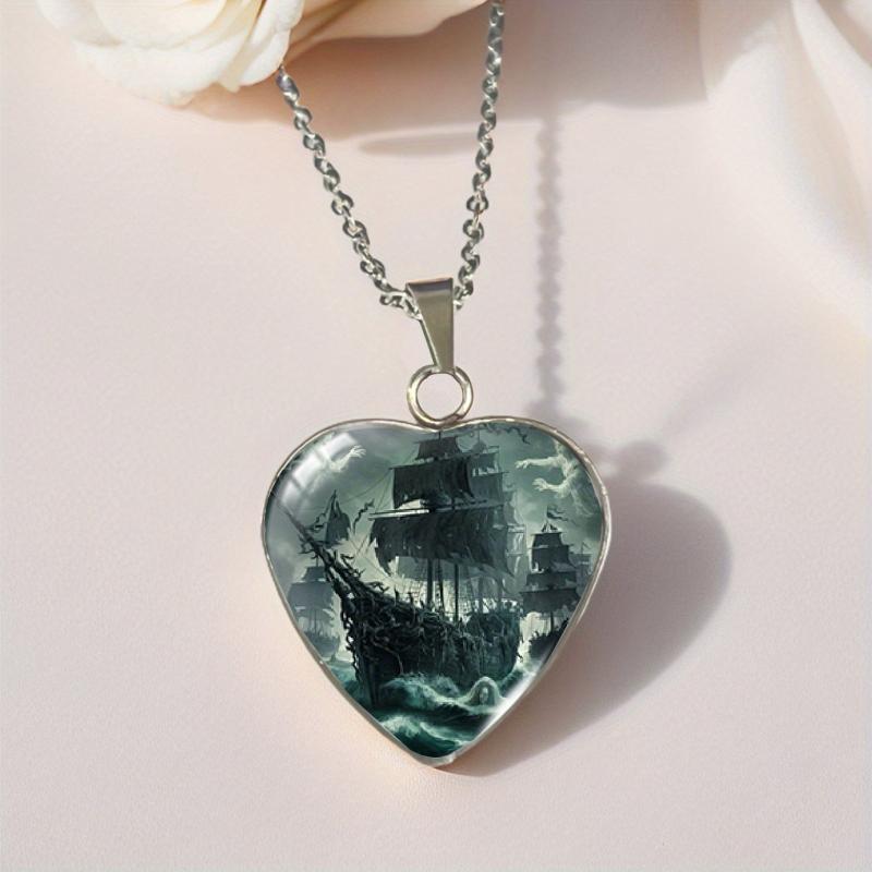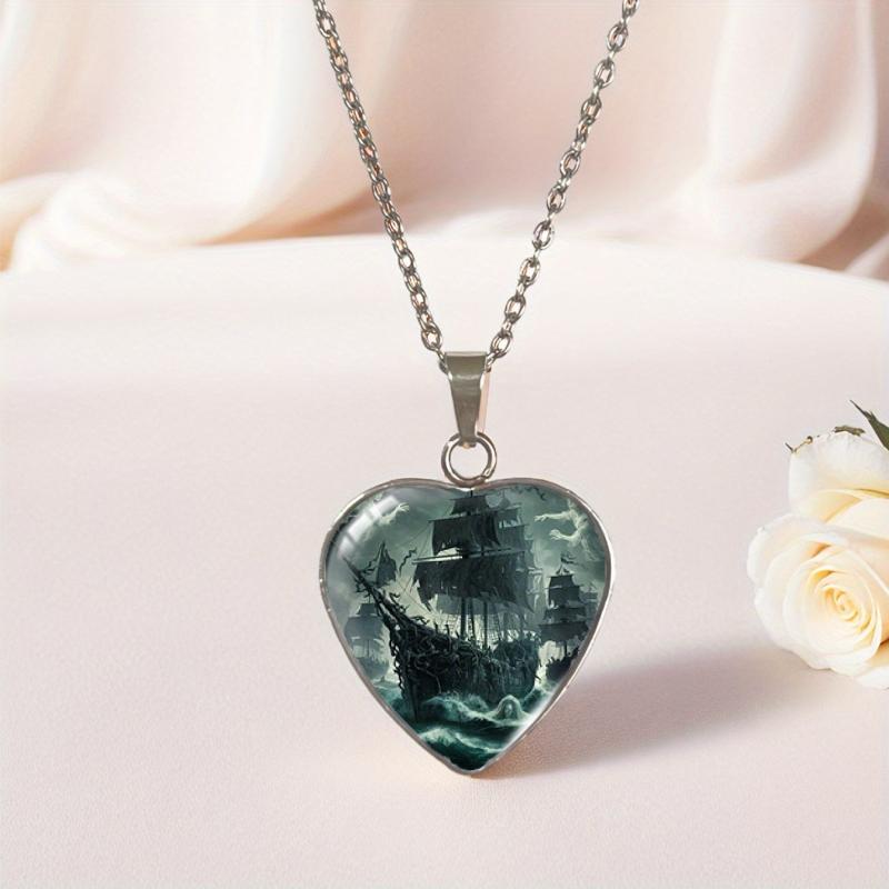 Unique and stylish Gothic-inspired necklace featuring a ghost pirate heart pendant made of stainless steel with a glass mosaic design. Perfect for daily wear and everyday jewelry.