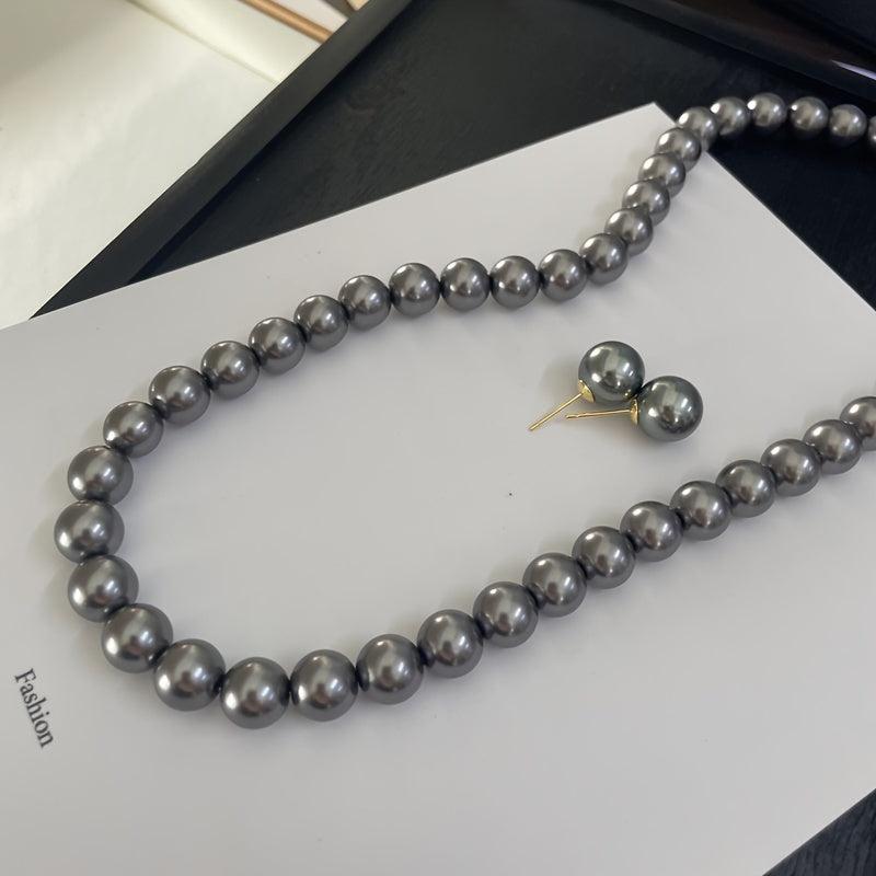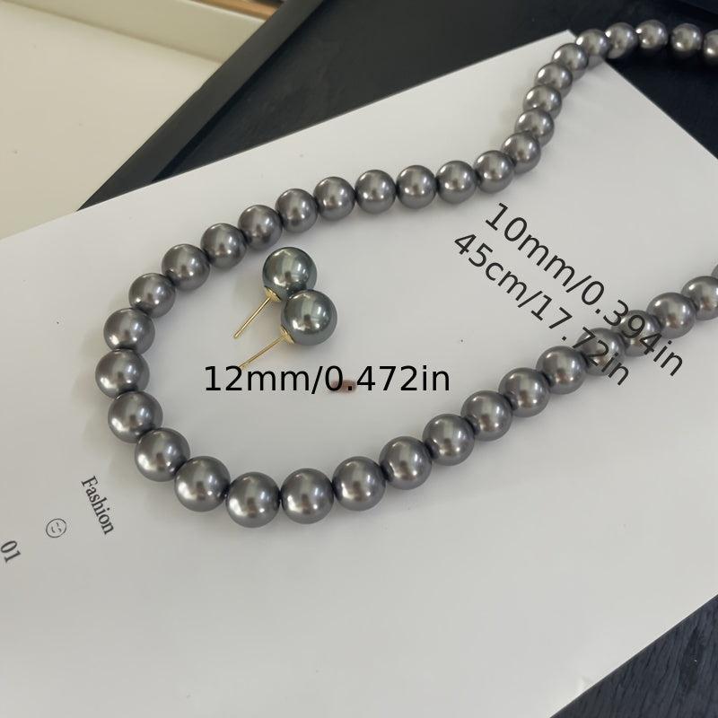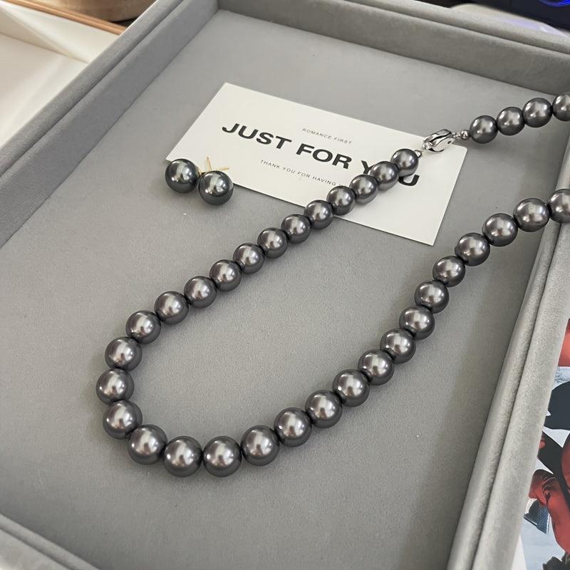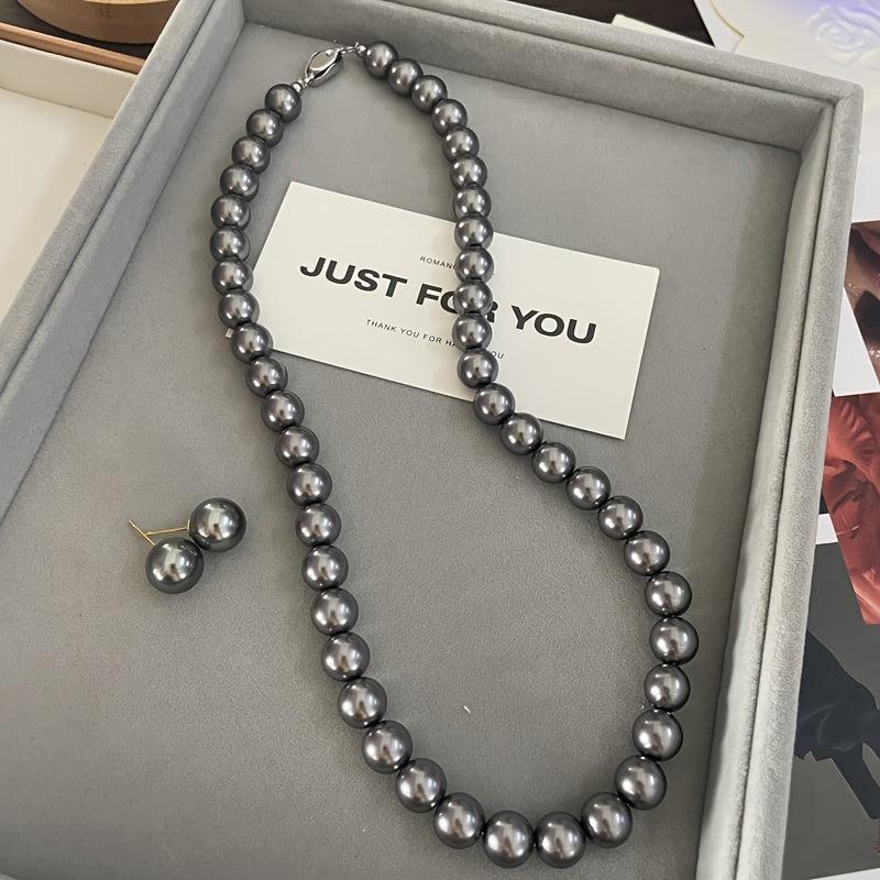 Elegant two-piece gray pearl necklace and earrings set perfect for any occasion. Makes a versatile gift for holidays or daily wear.