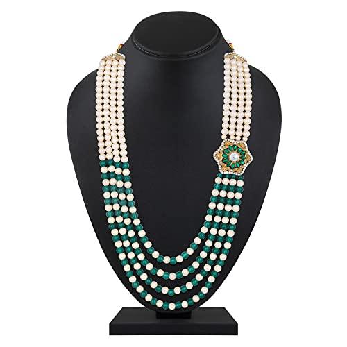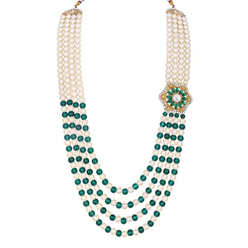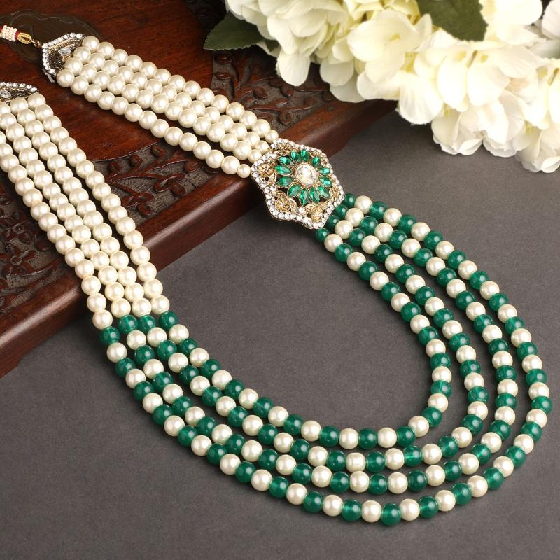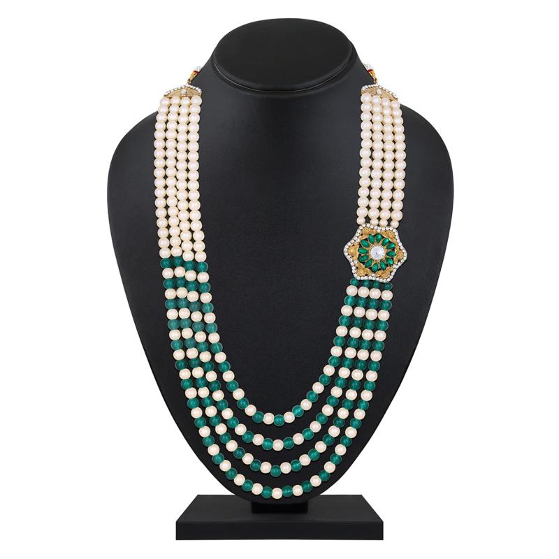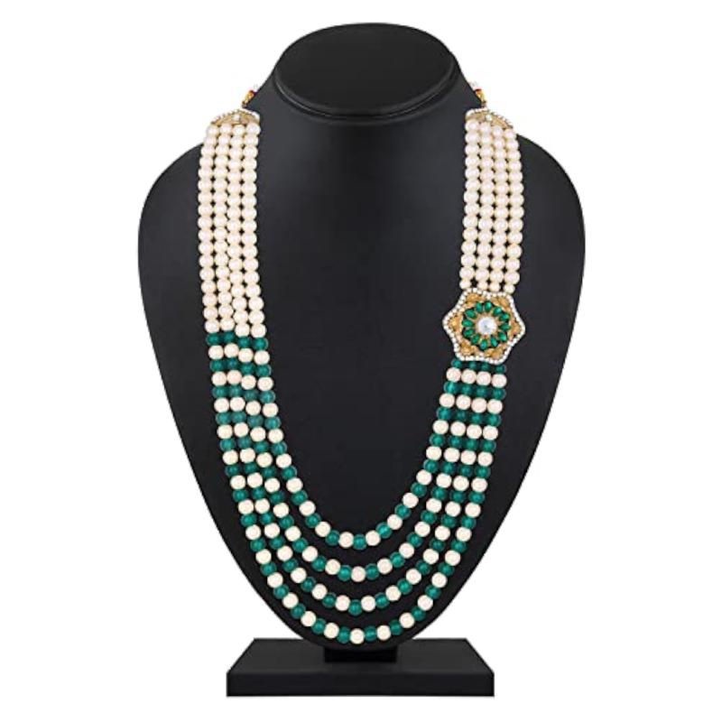 Elegant 4-layered groom's moti mala haar necklace with green and glass beads base. Perfect accessory for weddings.
