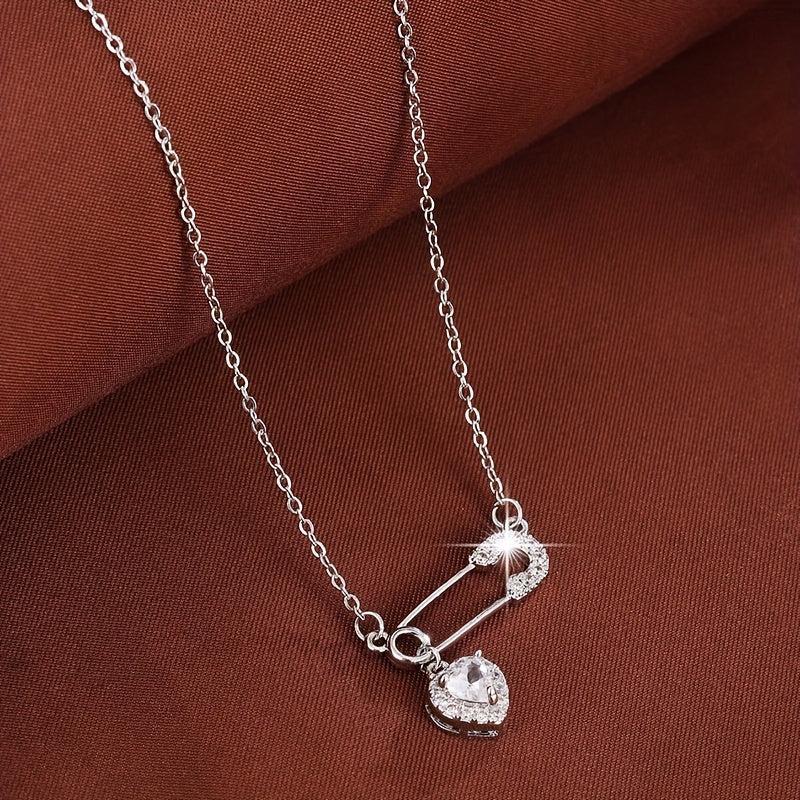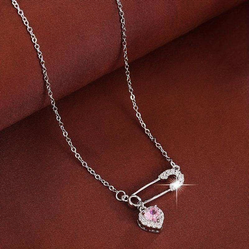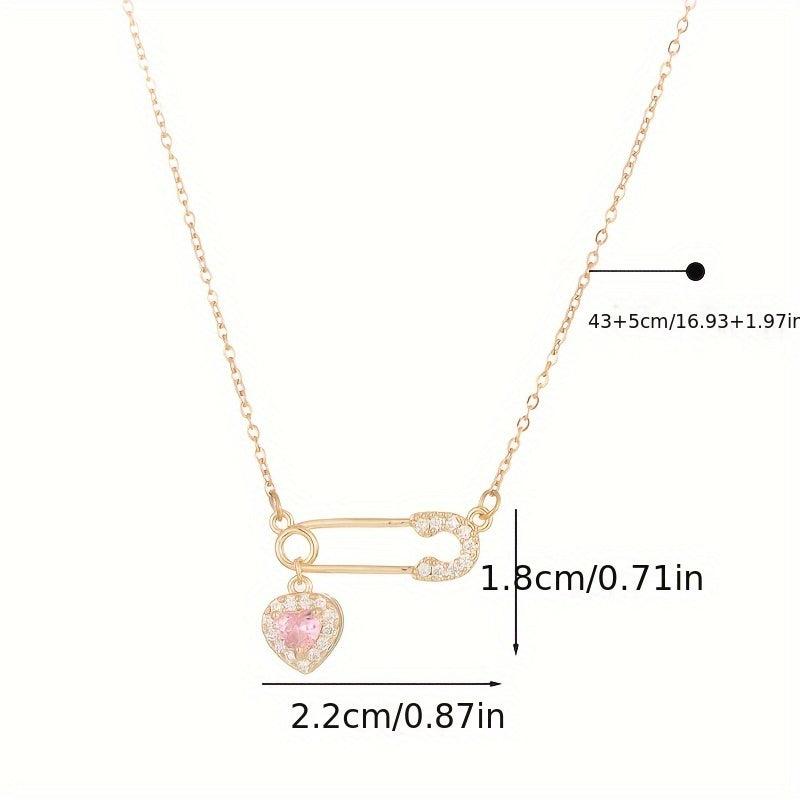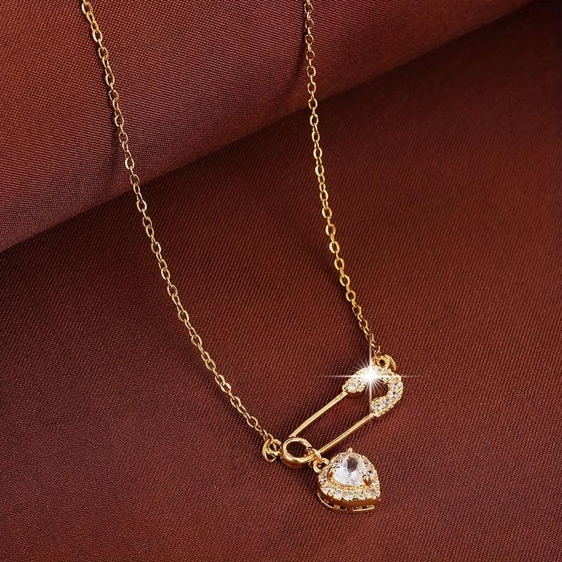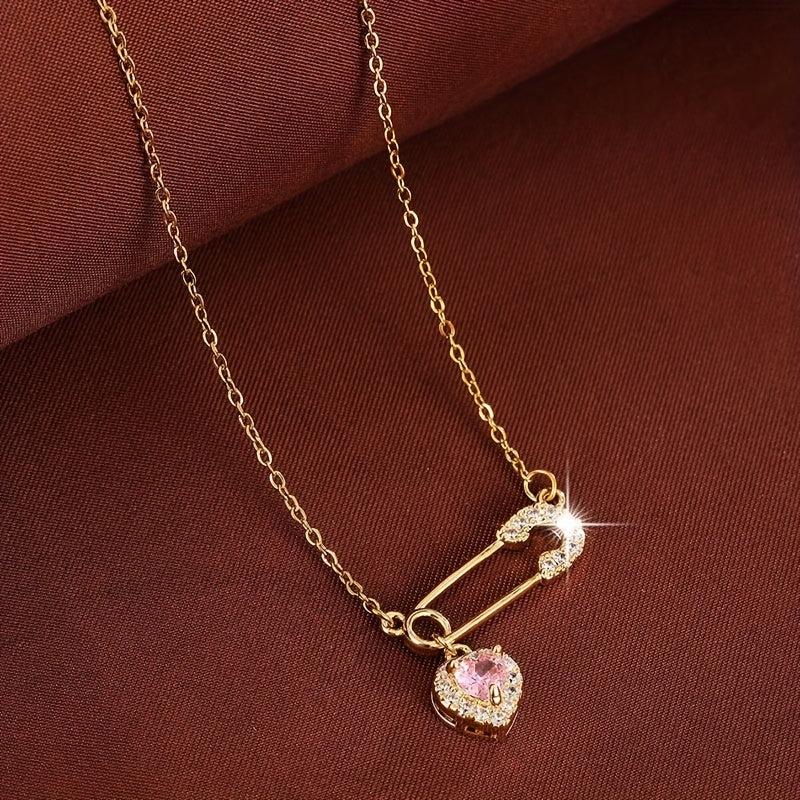 This delicate necklace features a heart-shaped safety pin design adorned with sparkling synthetic zirconia. It is crafted from golden tone copper, making it perfect for daily wear or as a thoughtful gift.