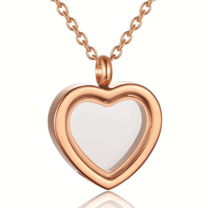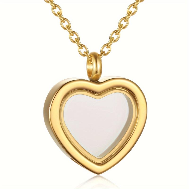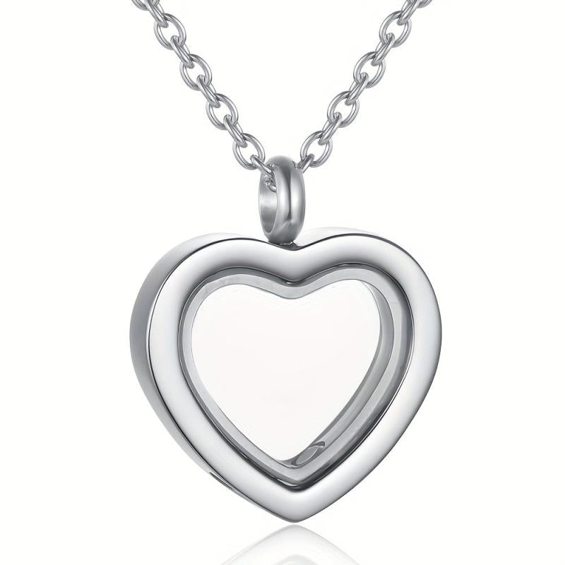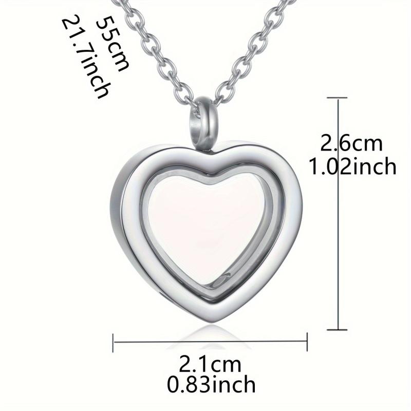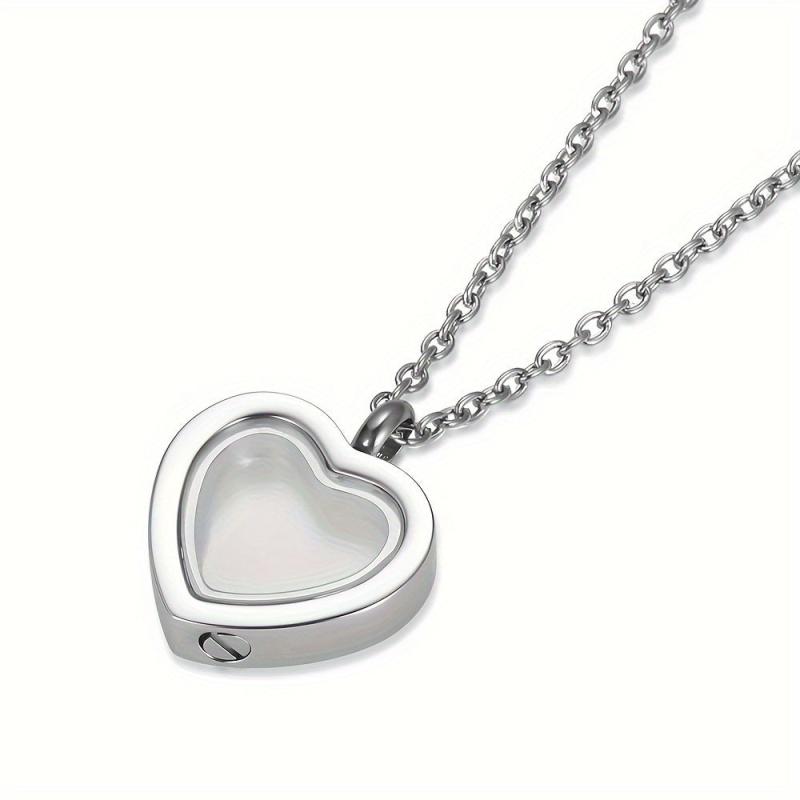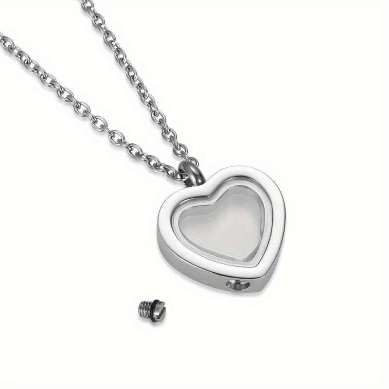 This stainless steel locket pendant necklace is designed to hold ashes or other keepsakes. It features a heart shape with a waterproof glass cover and includes a funnel for easy filling. Suitable for daily wear.