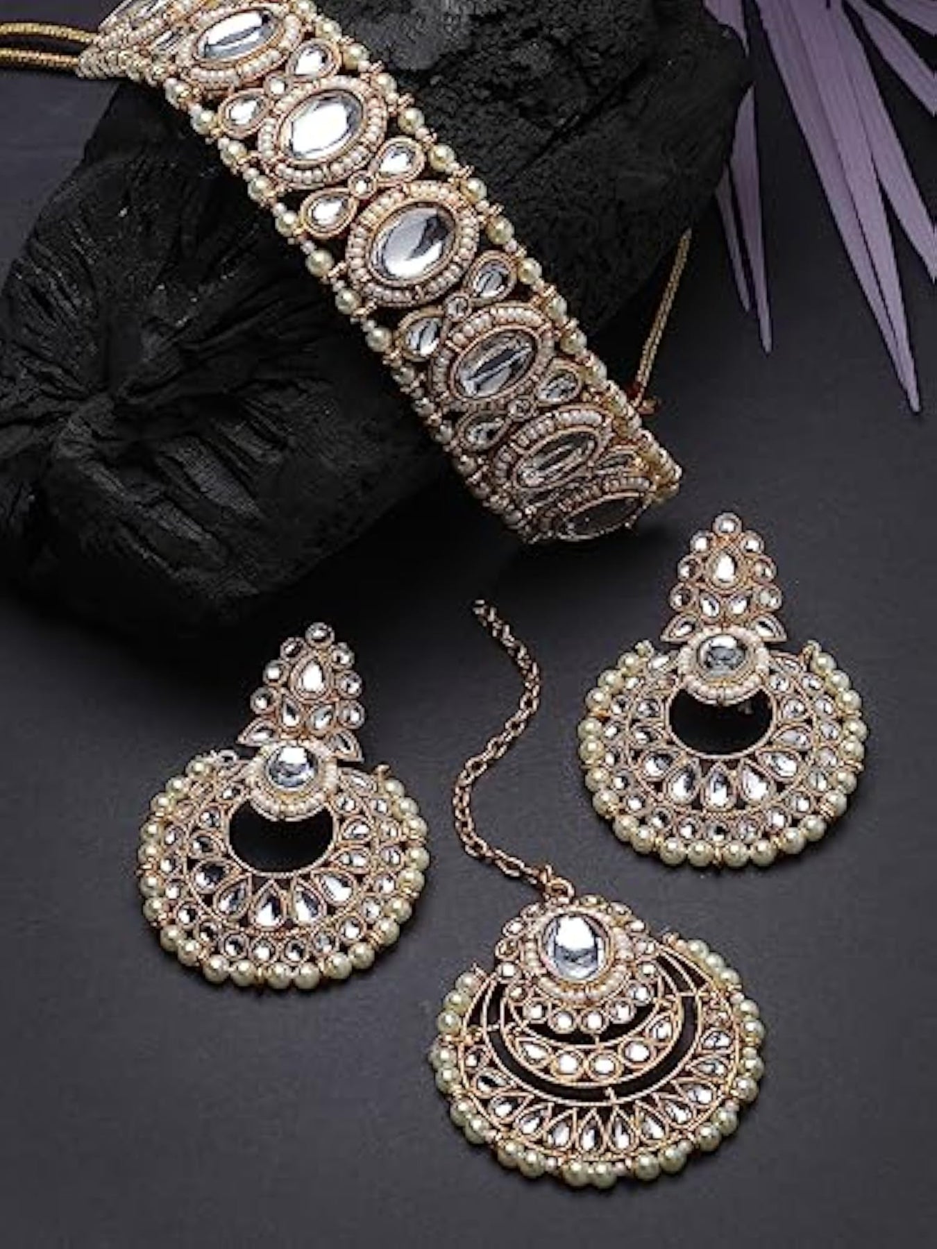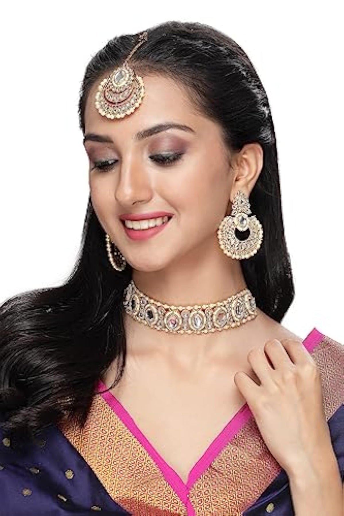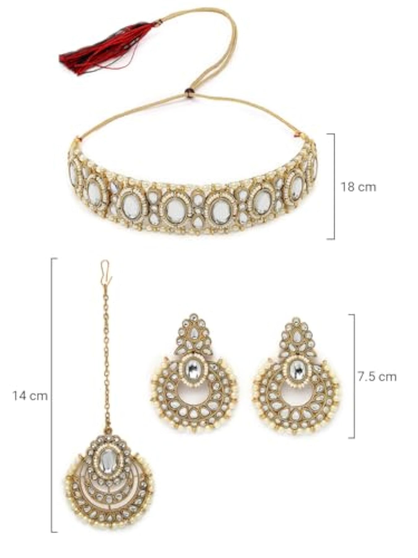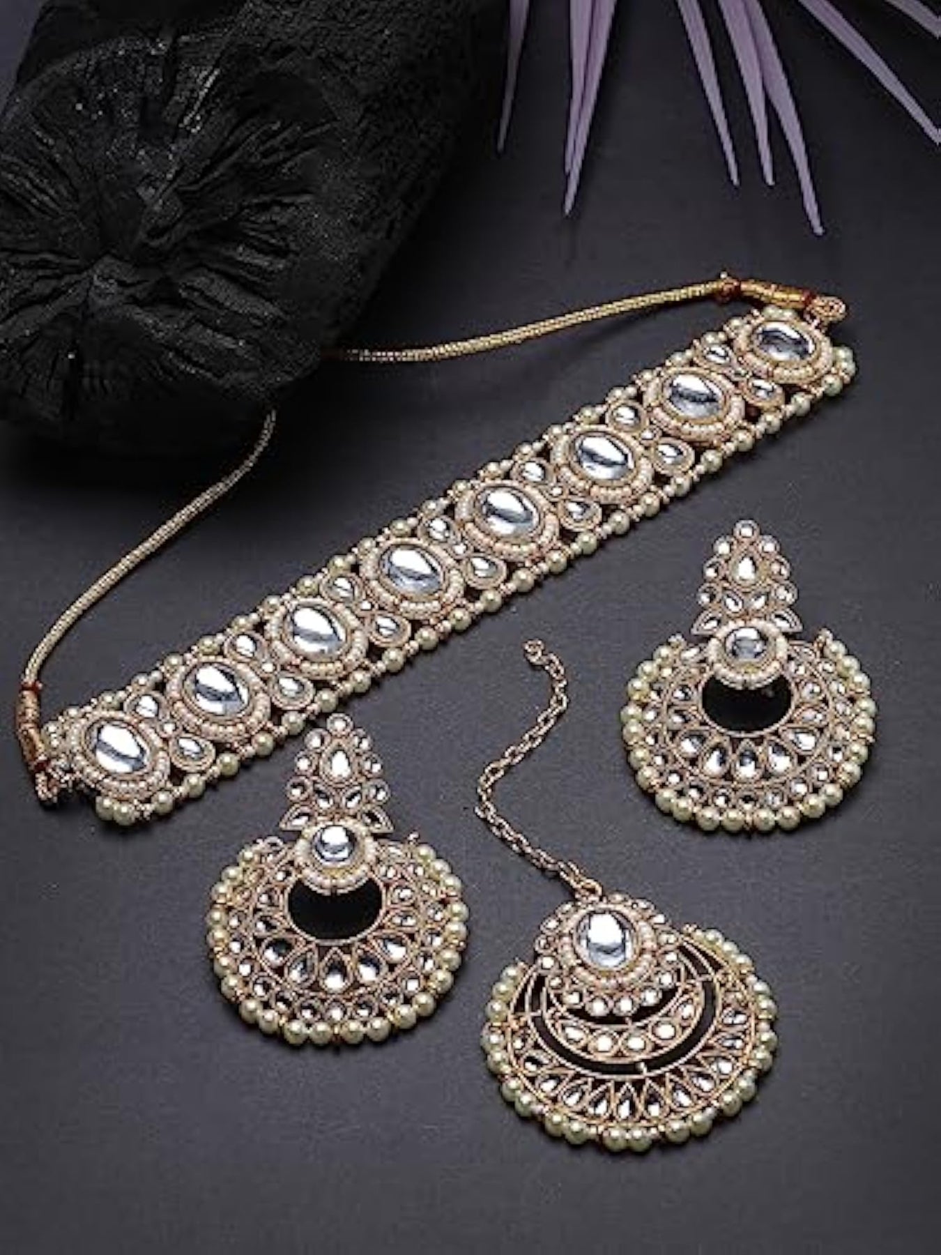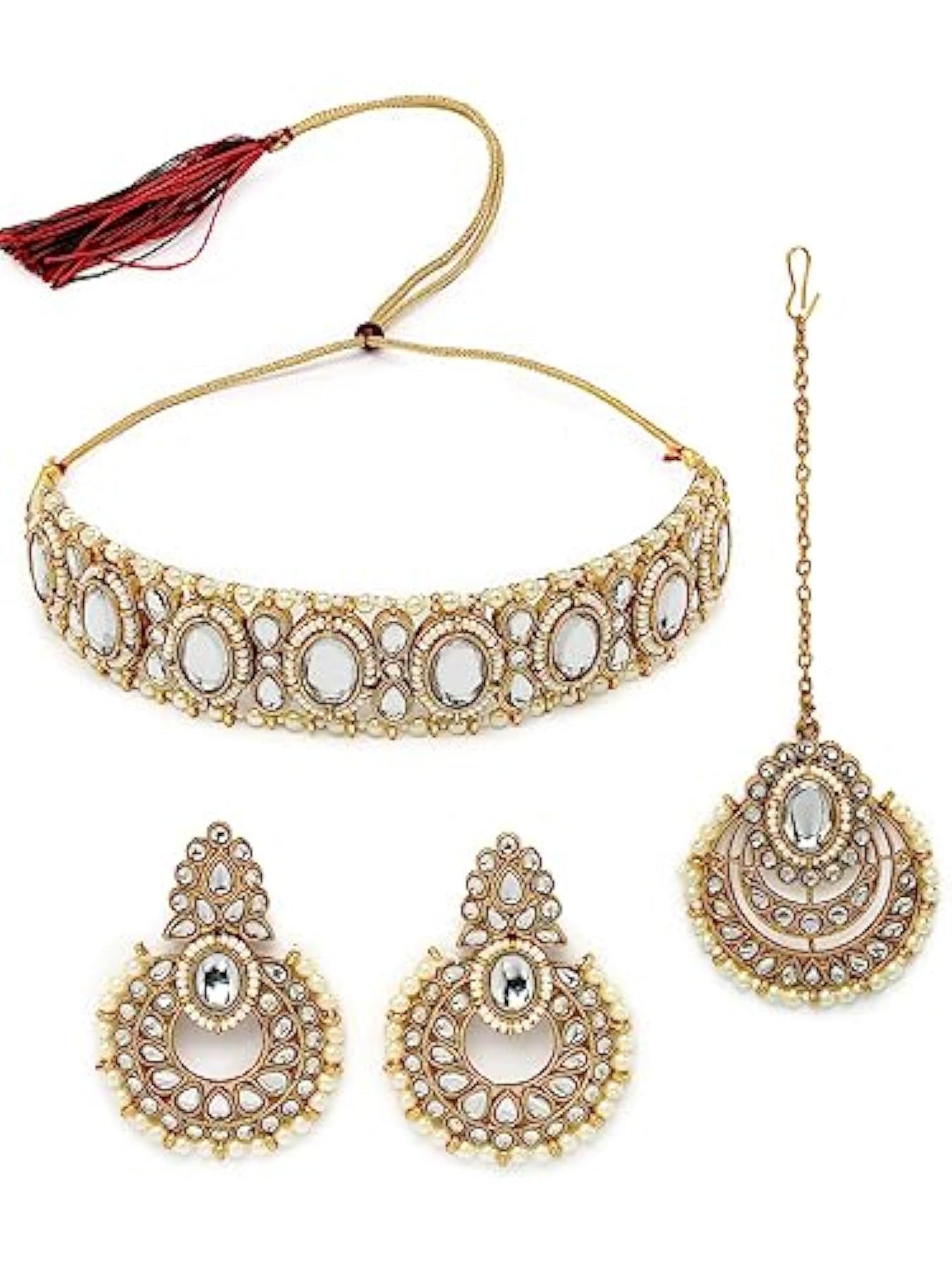 Elegant choker necklace set adorned with stones and beads, includes earrings and maangtika.