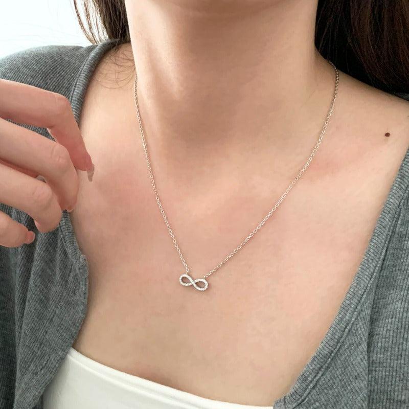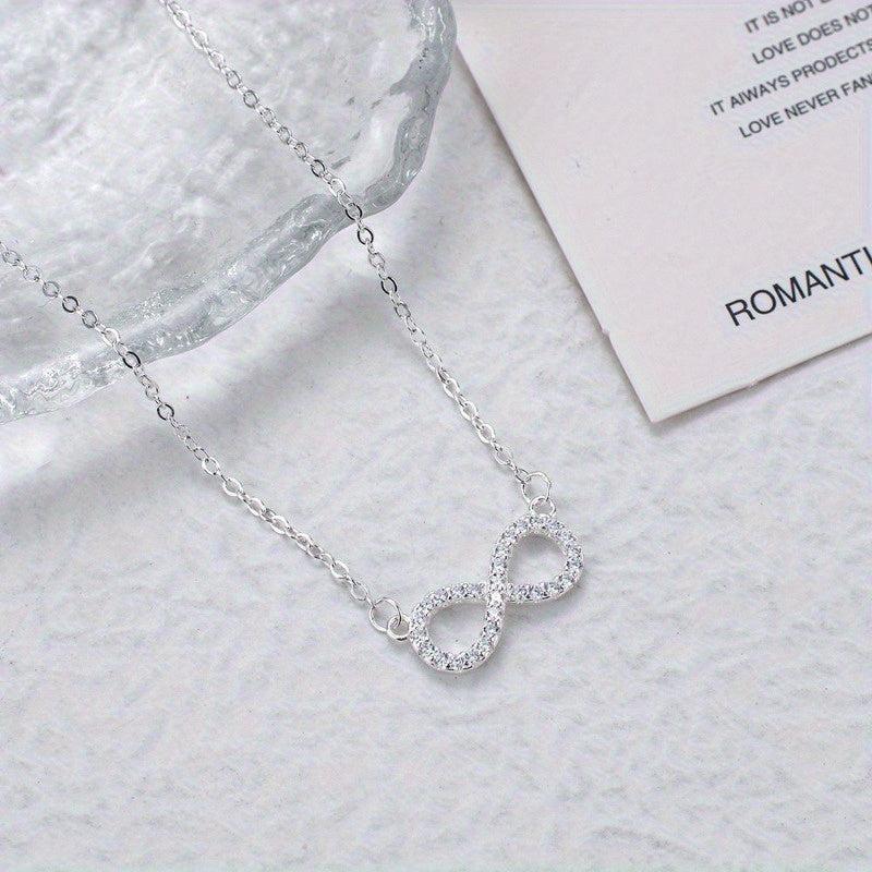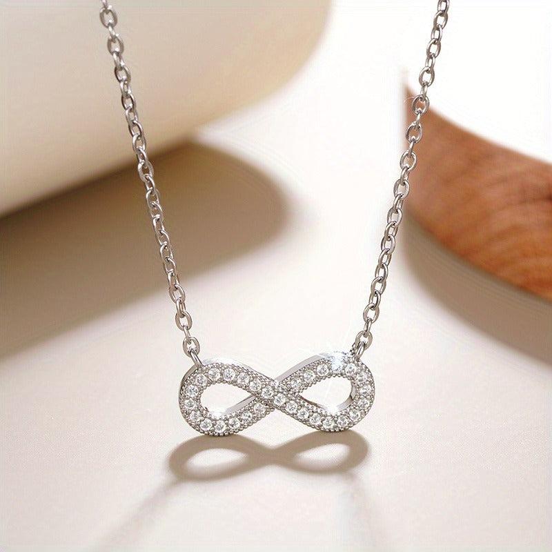 Elegant stainless steel necklace featuring an infinity symbol pendant with rhinestone accents. Perfect for daily wear or special occasions.