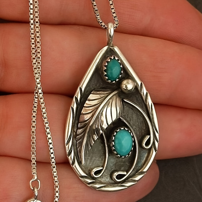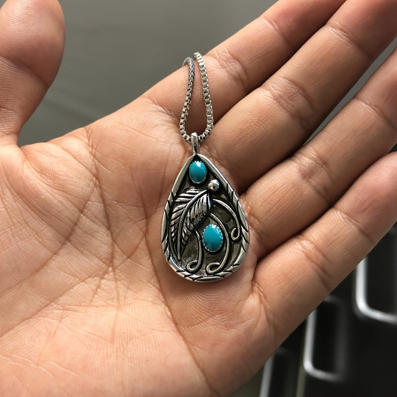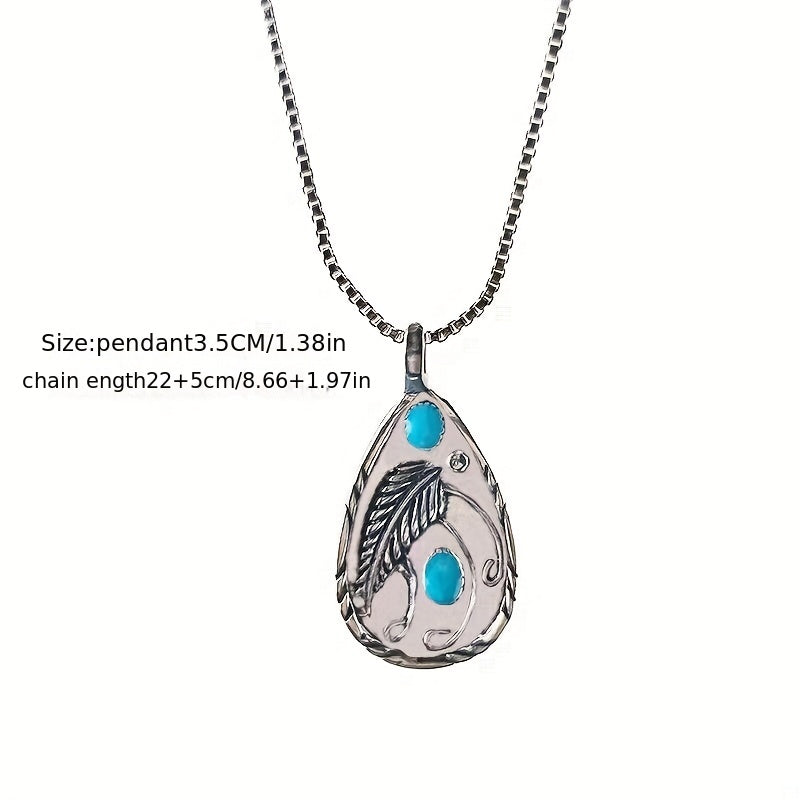 Elegant silver necklace with retro dyed feather pendant featuring inlaid turquoise.