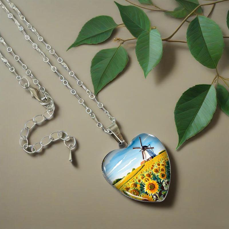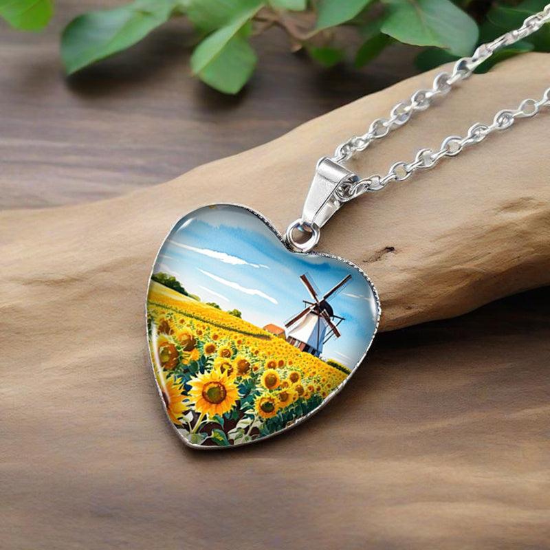 This necklace features a heart-shaped pendant with a sunflower field and windmill design, perfect for everyday wear or special occasions like birthdays and anniversaries.