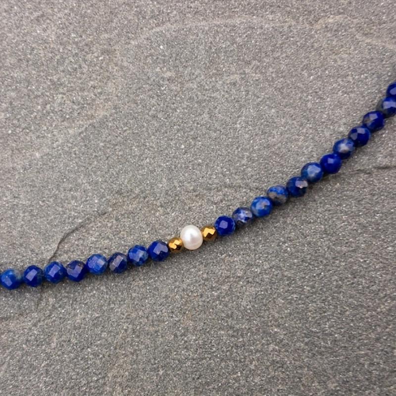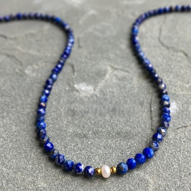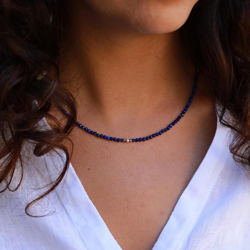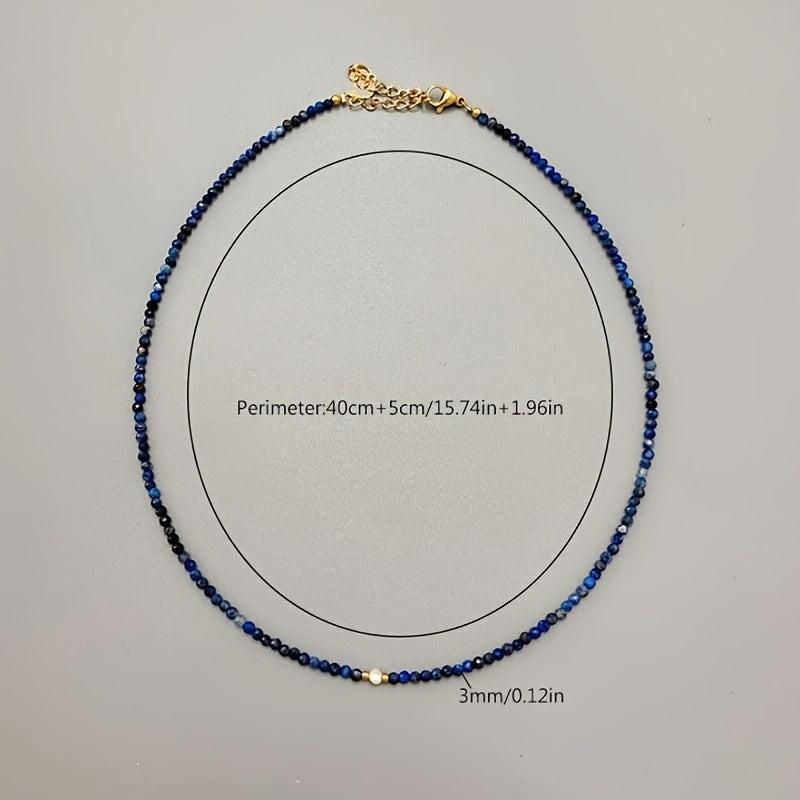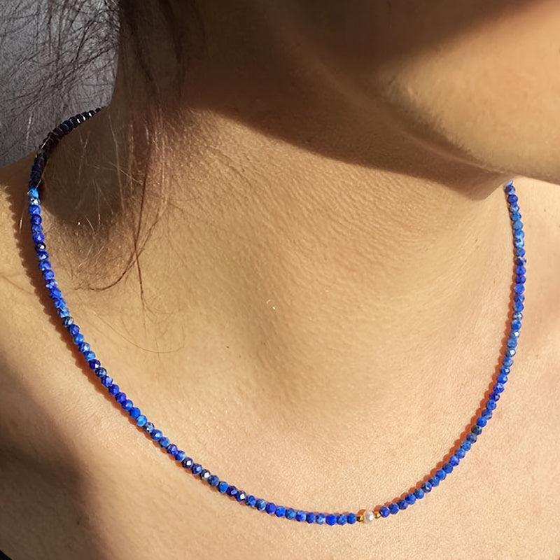 Elegant lapis lazuli necklace with golden tone spacers on a delicate chain. Perfect for women who prefer minimalist jewelry.