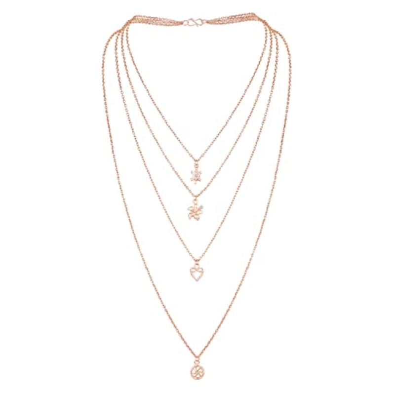 Elevate your style with this layered necklace featuring multiple charms. This necklace combines a tortoise, heart, wheel, and floral charm pendants for a trendy and chic look.