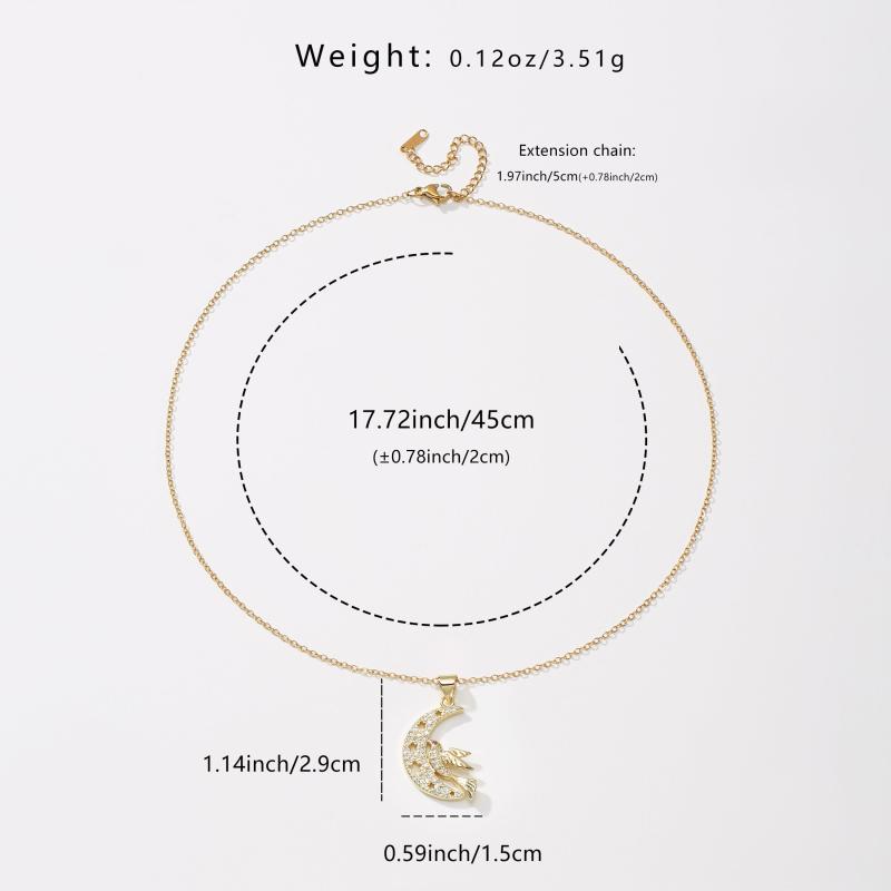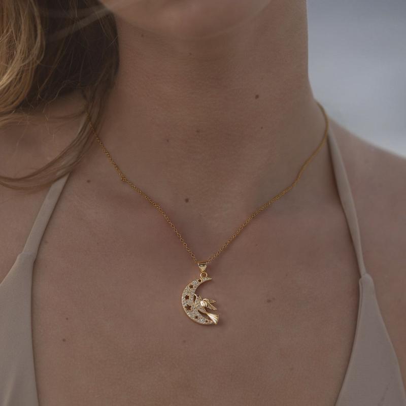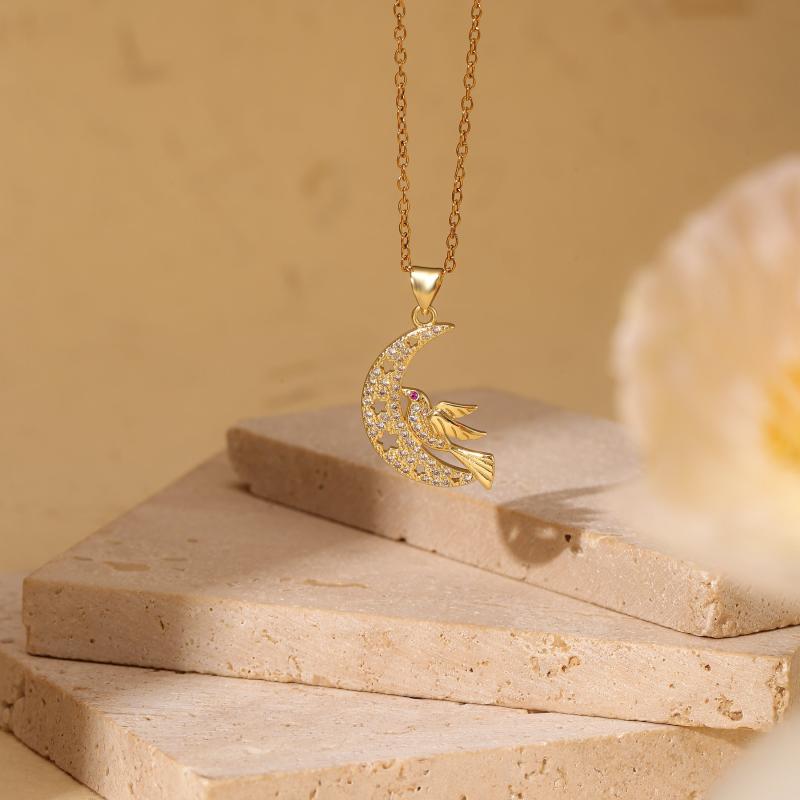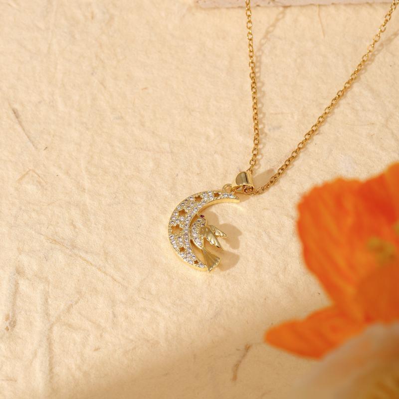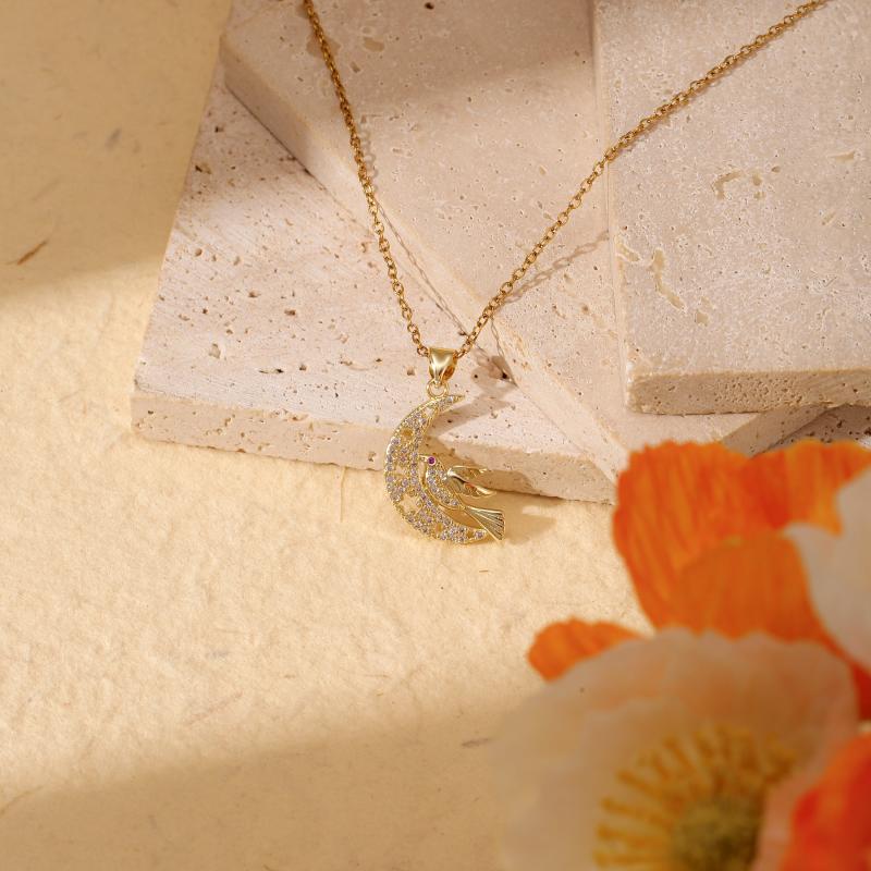 This necklace features a moon and bird pendant in hypoallergenic stainless steel with coating and synthetic stones. Lightweight and perfect for a beach look.