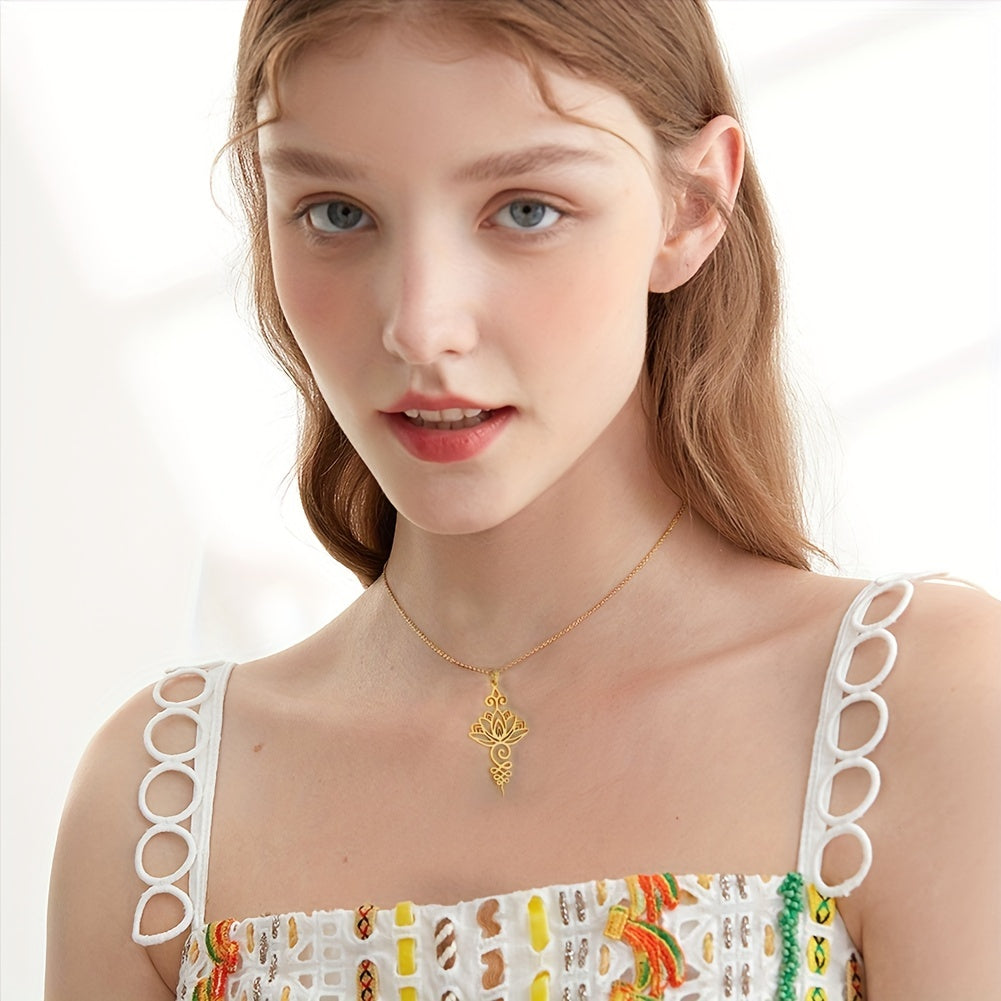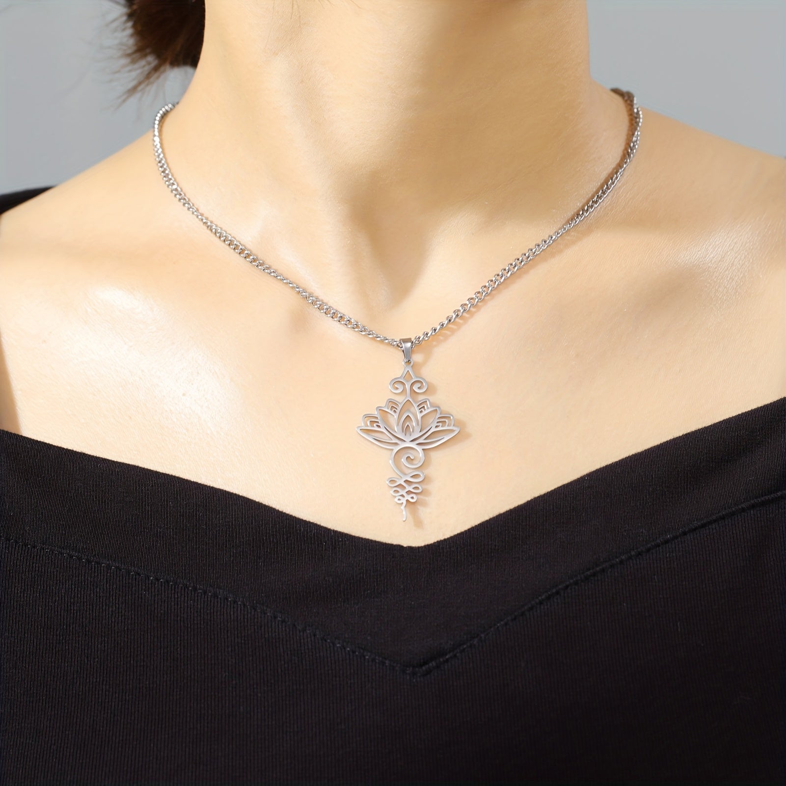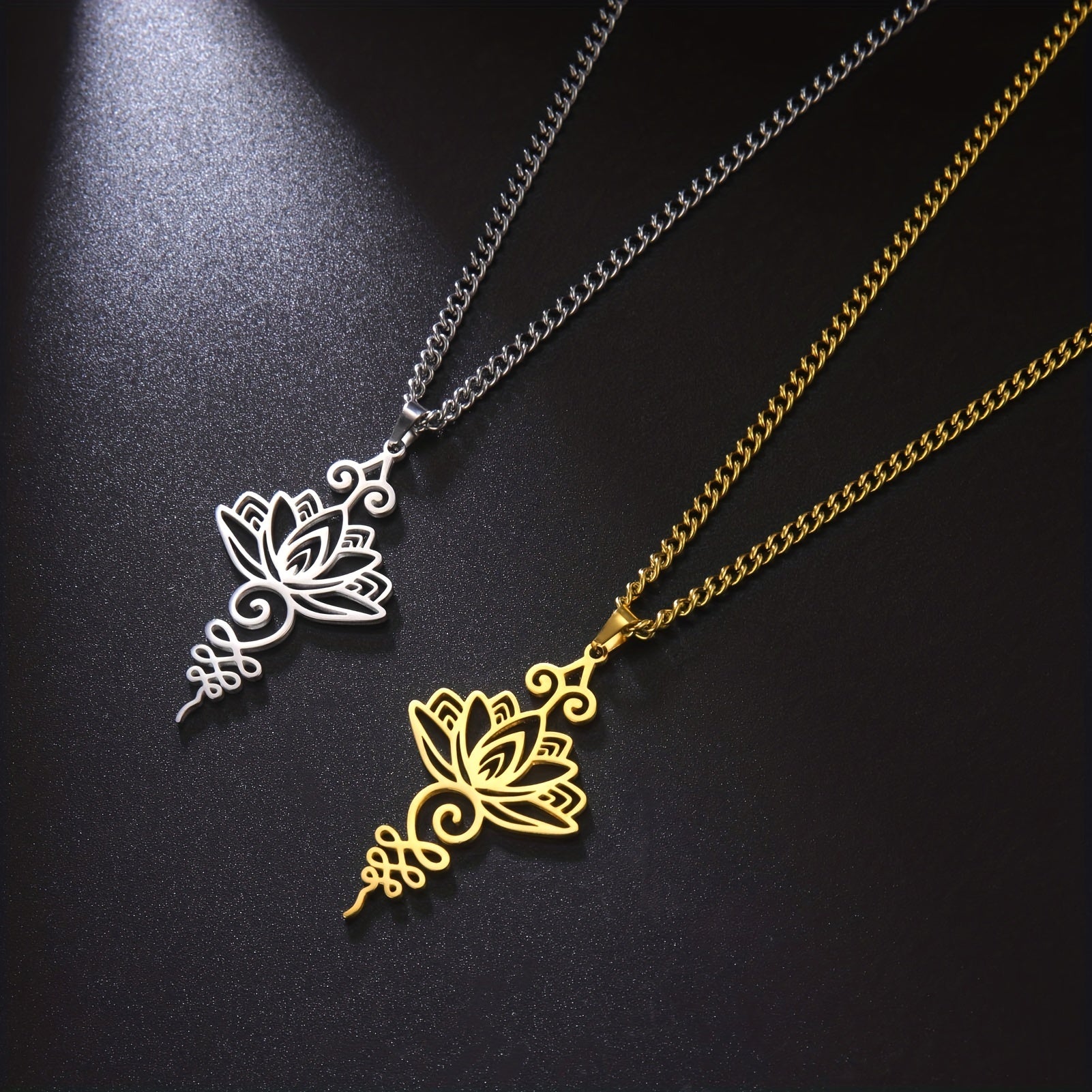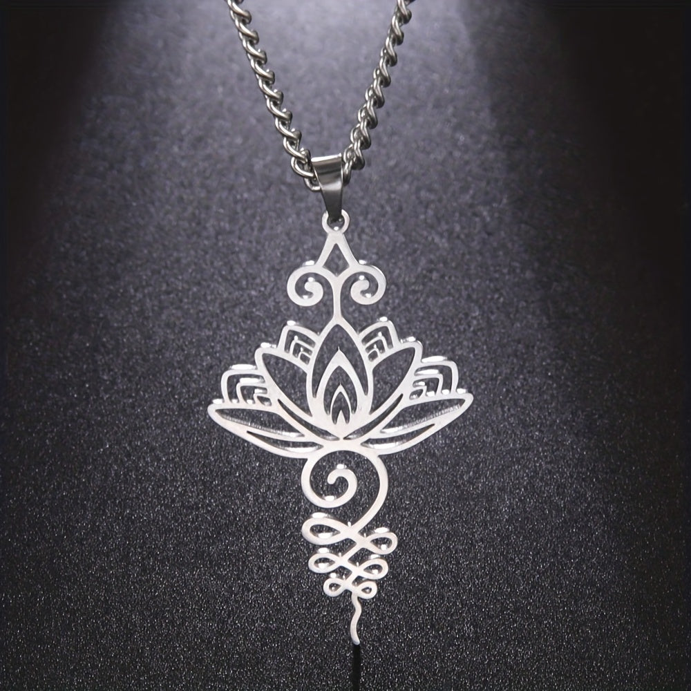 Stainless steel necklace featuring a lotus flower pendant with Unalome chakra symbol, perfect for yoga and healing practices. Ideal Christmas gift for loved ones.
