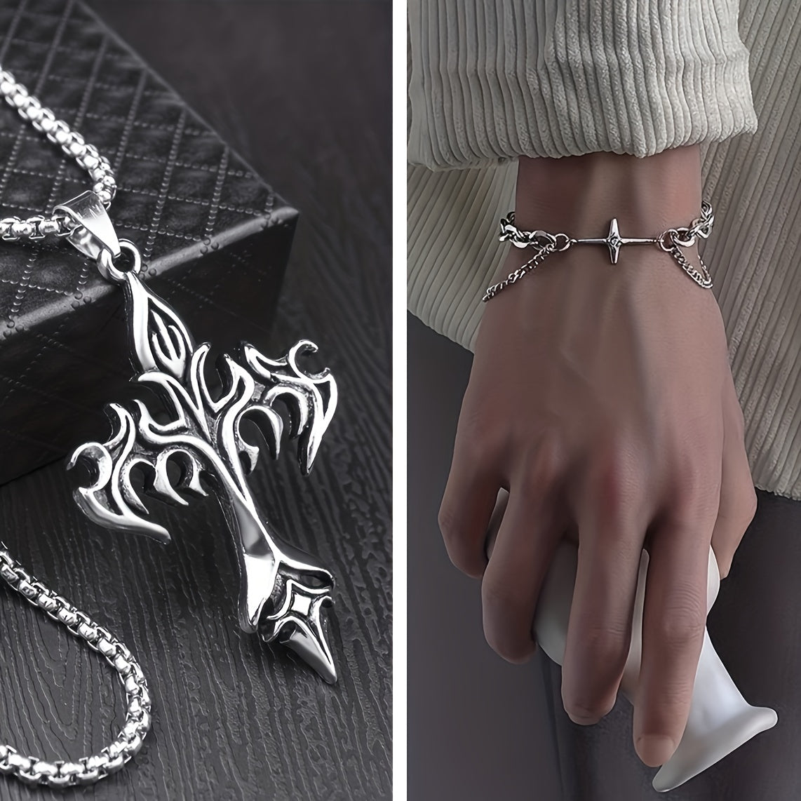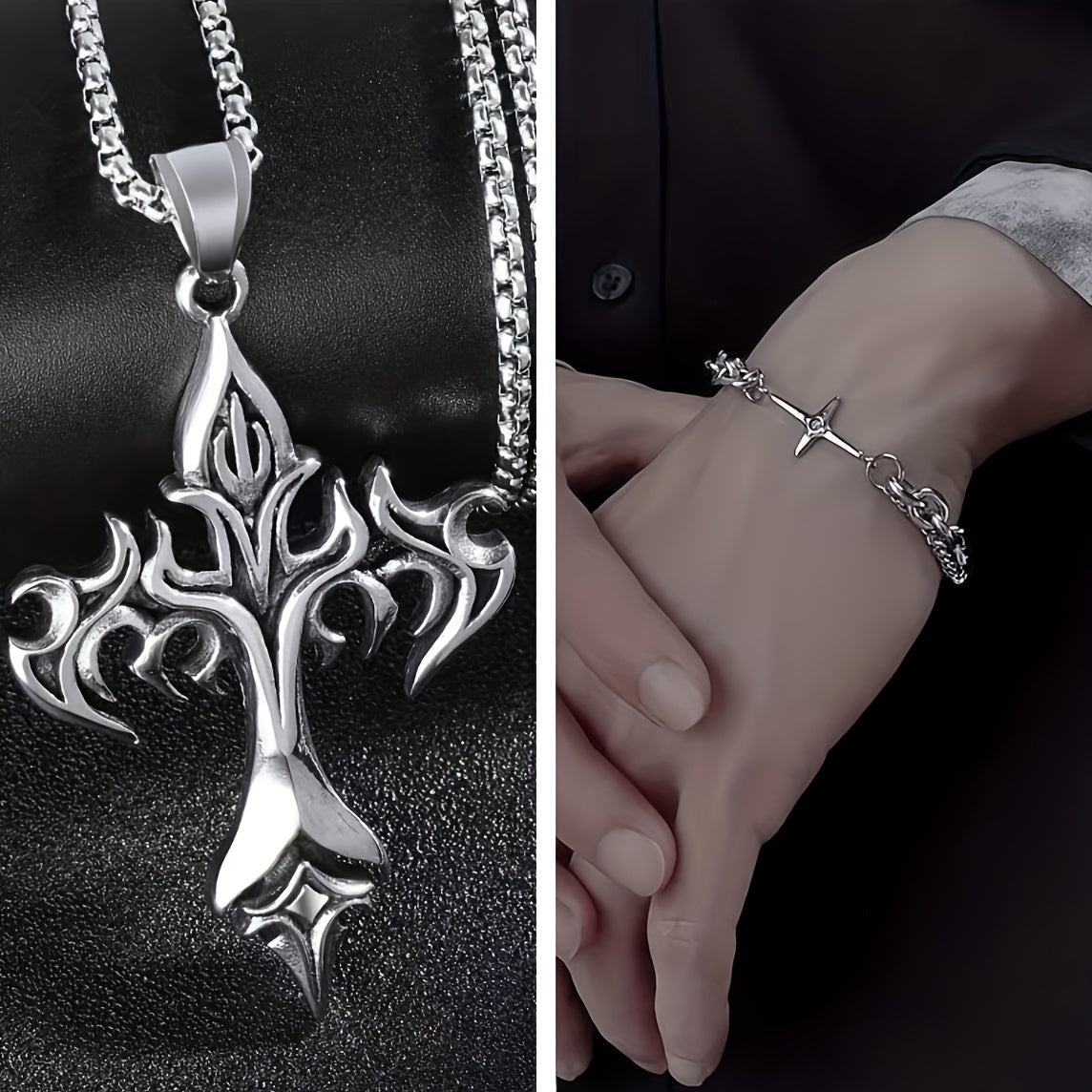 This set includes a cross and star pendant necklace and bracelet, perfect for men, couples, or women. Made of high-quality materials, it is a great gift idea for any occasion.