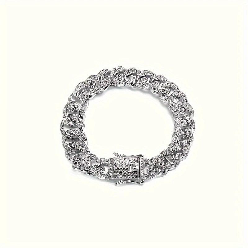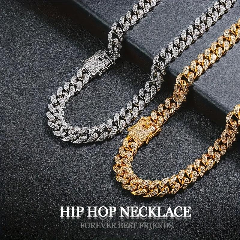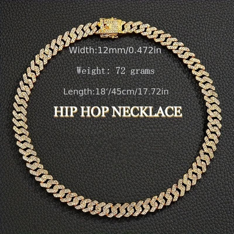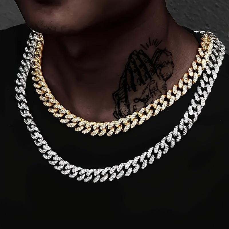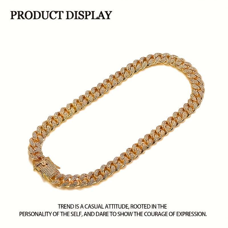 This golden tone Cuban chain necklace features shimmering rhinestones, perfect for adding a touch of bling to any outfit. High durable chain style suitable for both casual and formal wear, making it a great gift for men.