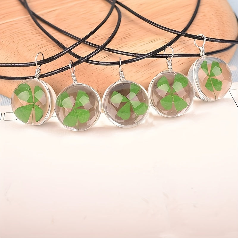 Men's Dried Flower Clover Glass Ball Pendant Necklace Time Gem Clover