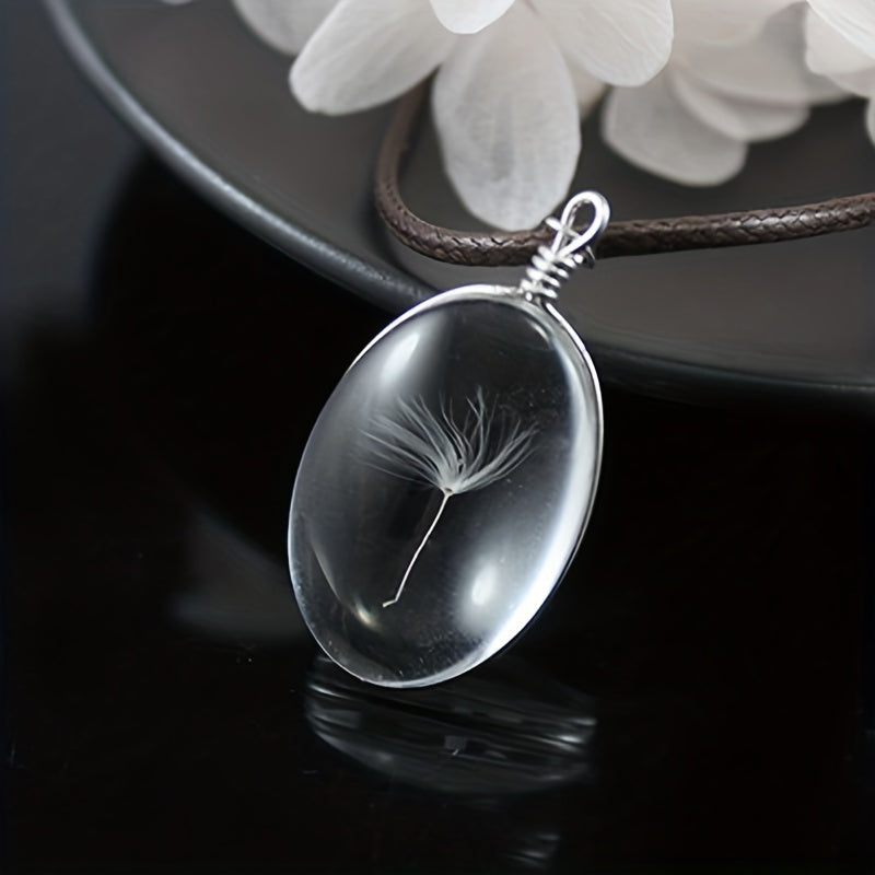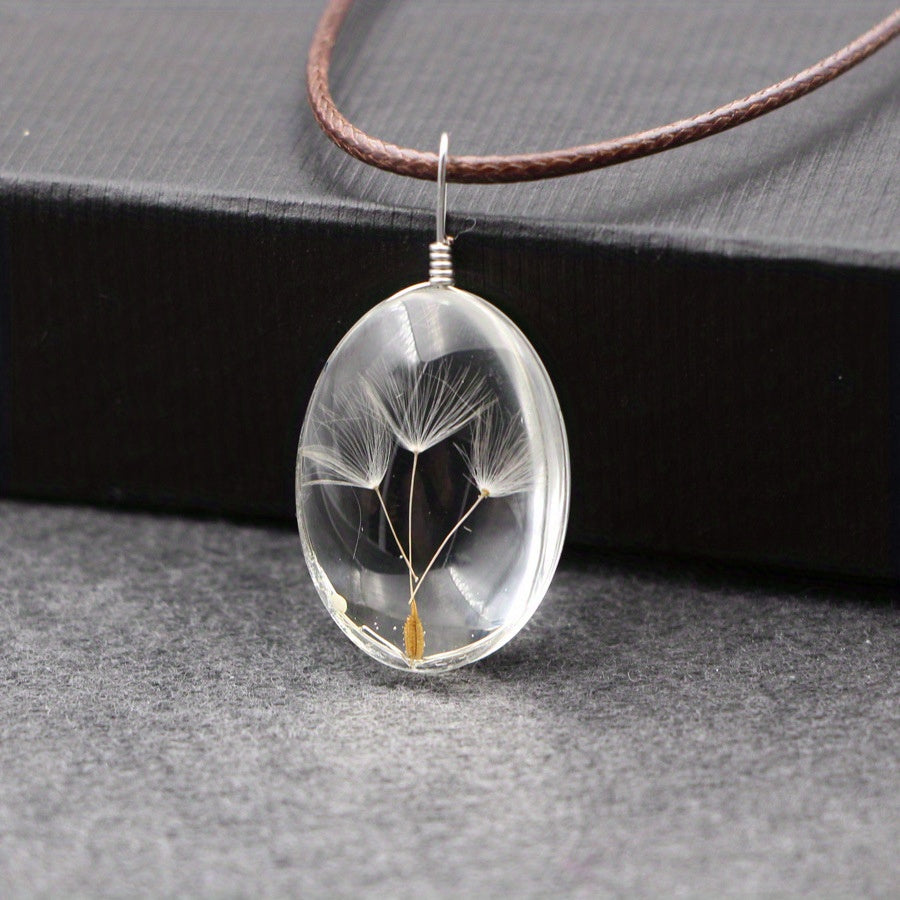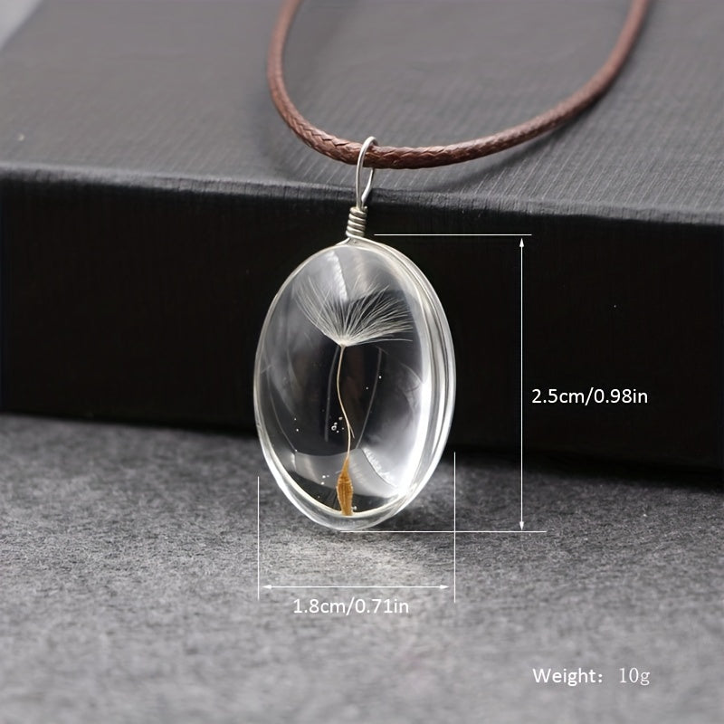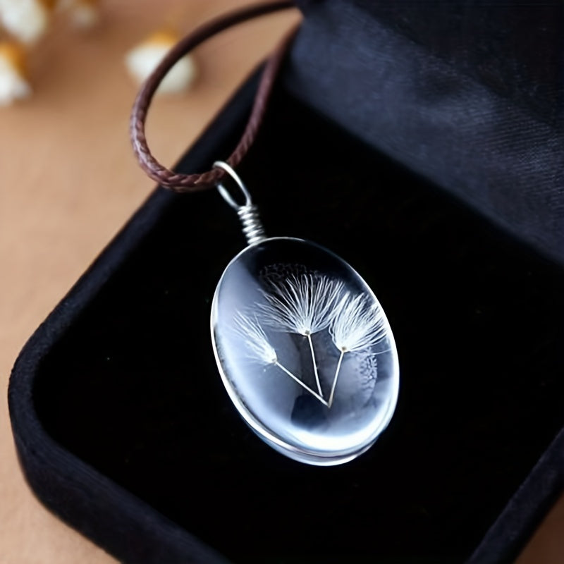 This pendant necklace features a creative design with a dried flower enclosed in a glass ball, set in an oval time gemstone pendant. A unique and stylish accessory for men.