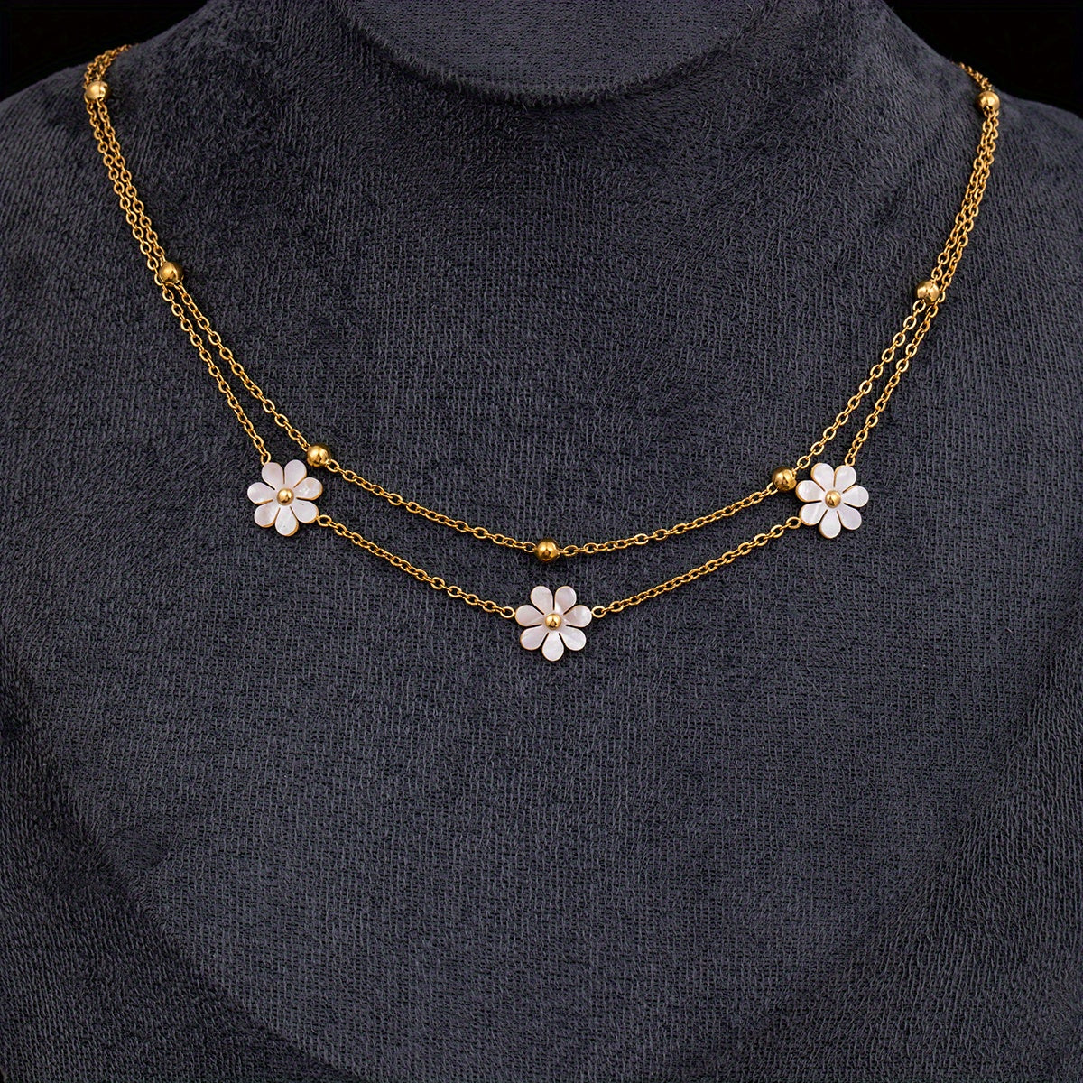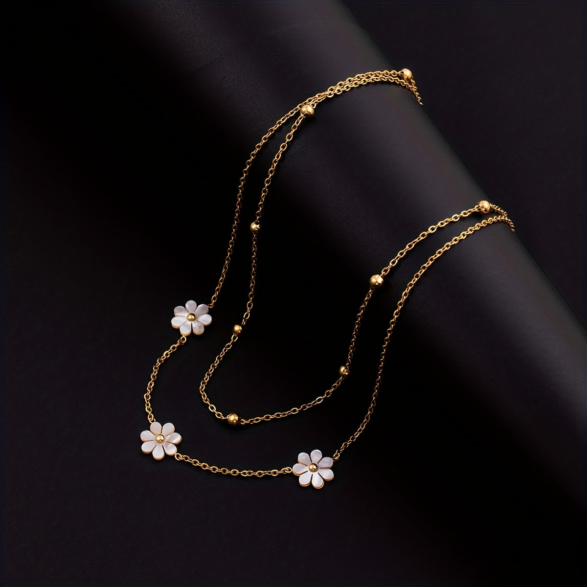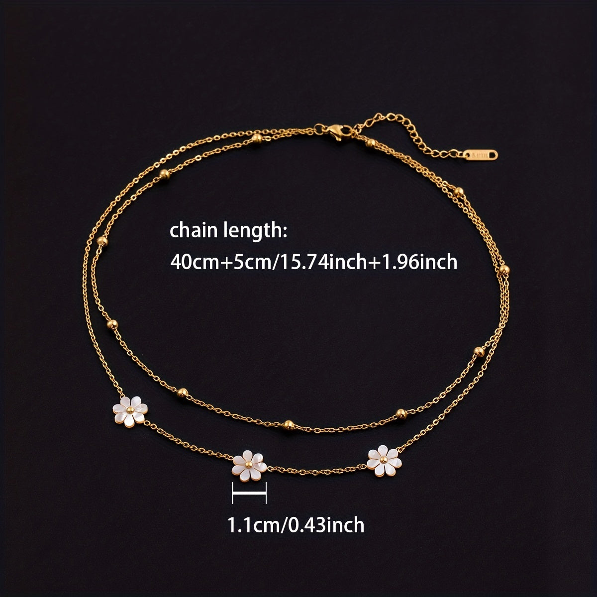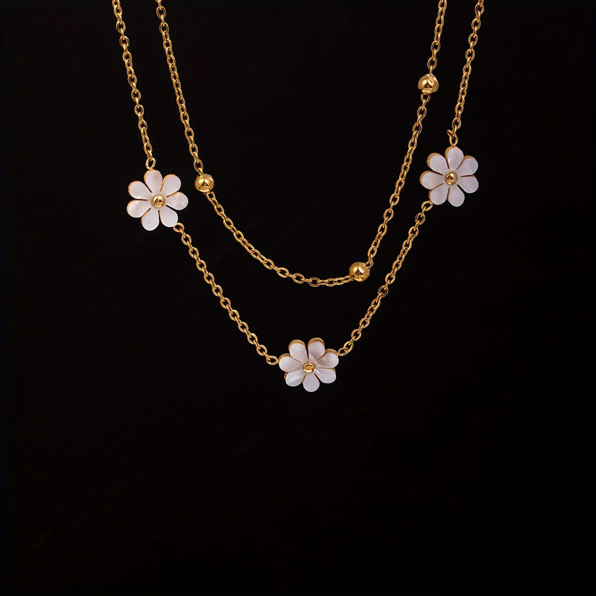 This necklace features a boho style design with flowers and shells, made of golden stainless steel. It is double-layered and the pendant chain is adjustable, making it a versatile accessory for both men and women.