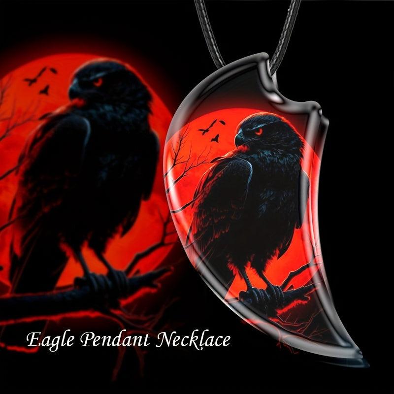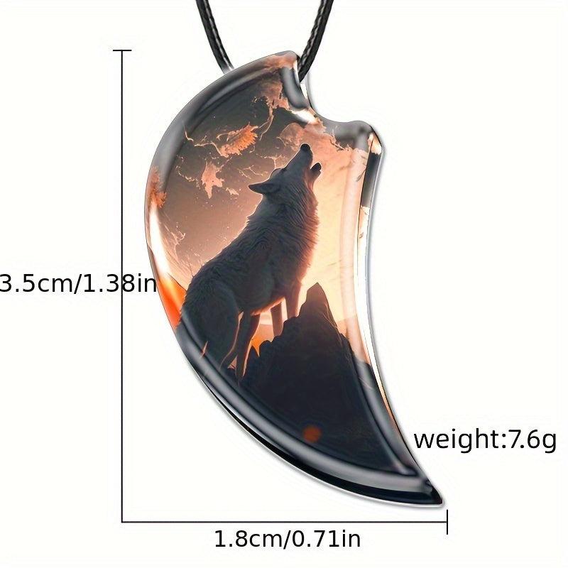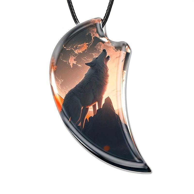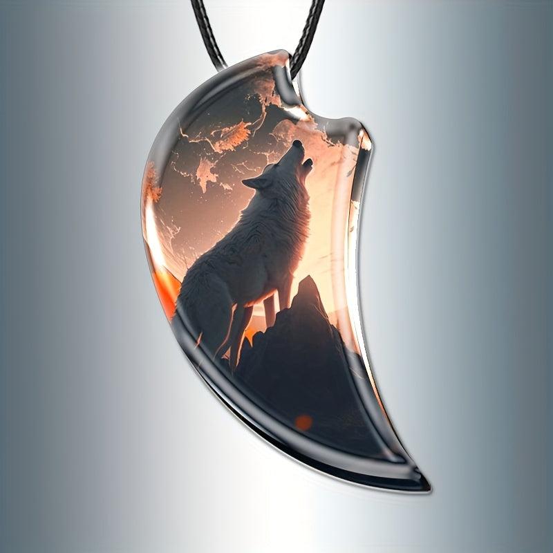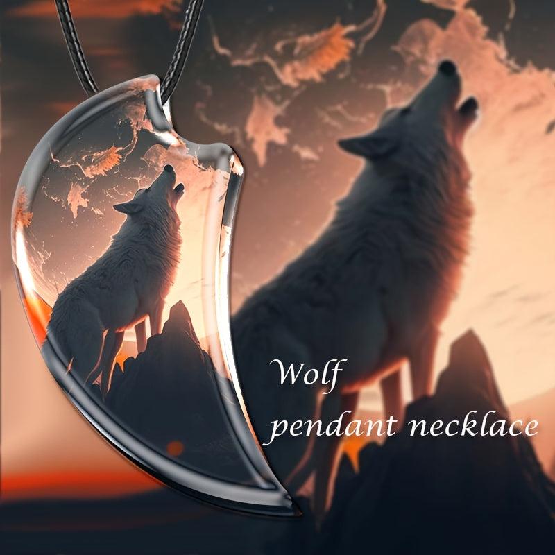This men's necklace features a howling wolf design with a crescent moon pendant and dual wolf high clear glass. A stylish accessory for any wolf lover.