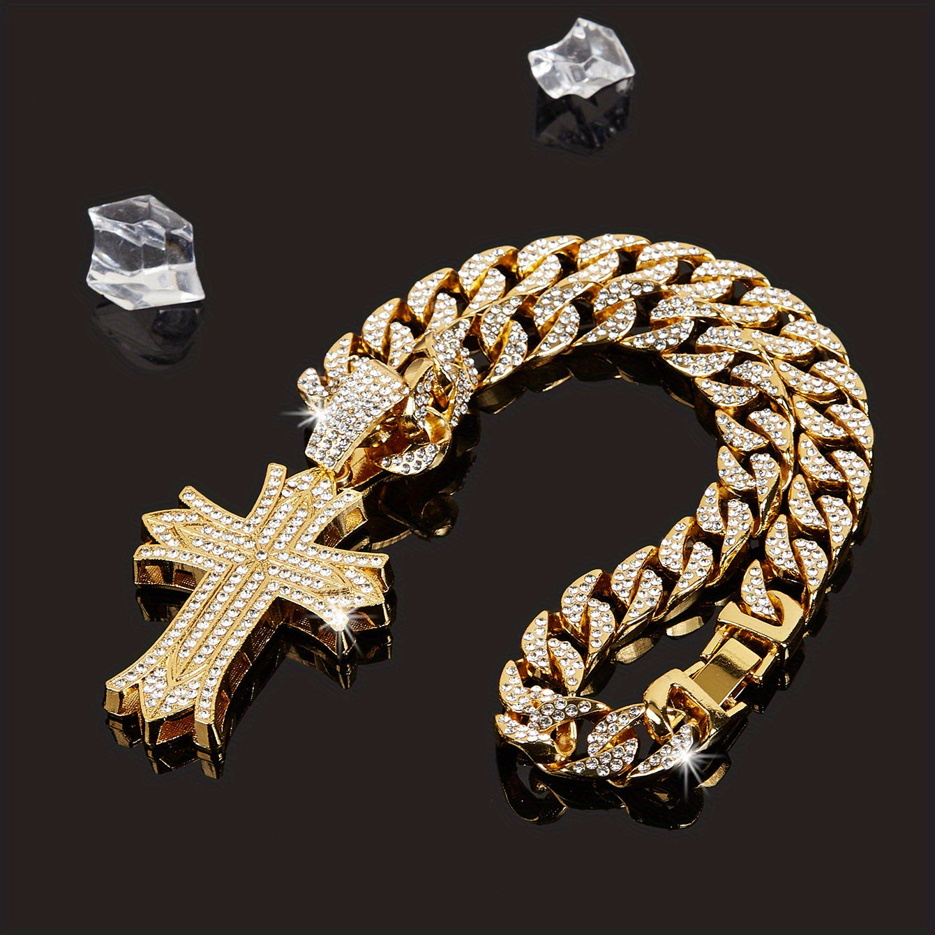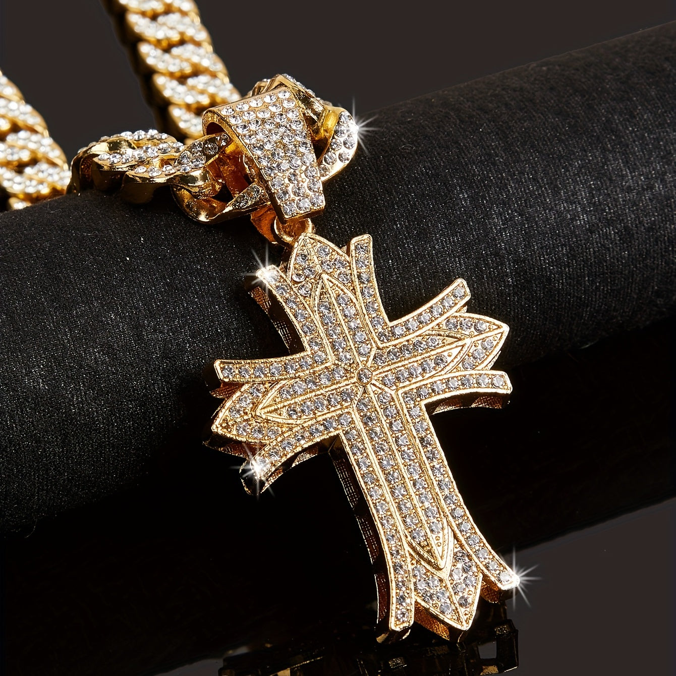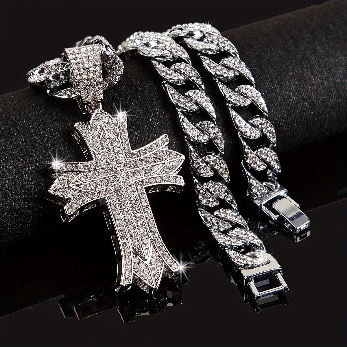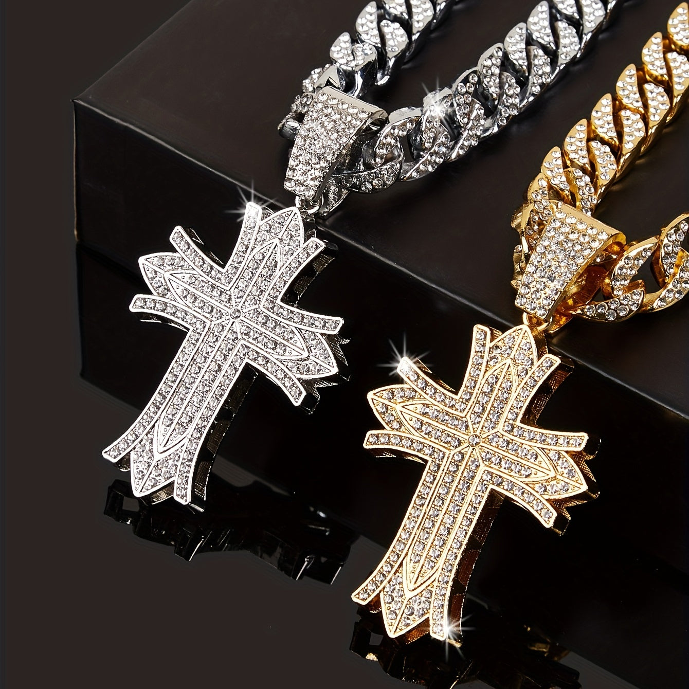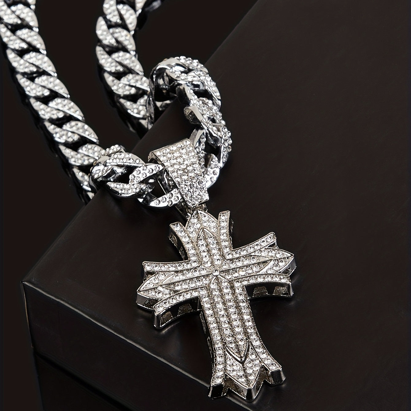 Enhance your style with this stunning punk-inspired necklace featuring a faux diamond-encrusted Cuban chain and a bold cross pendant.