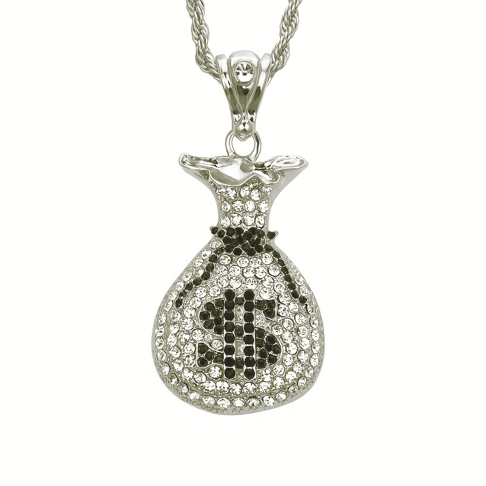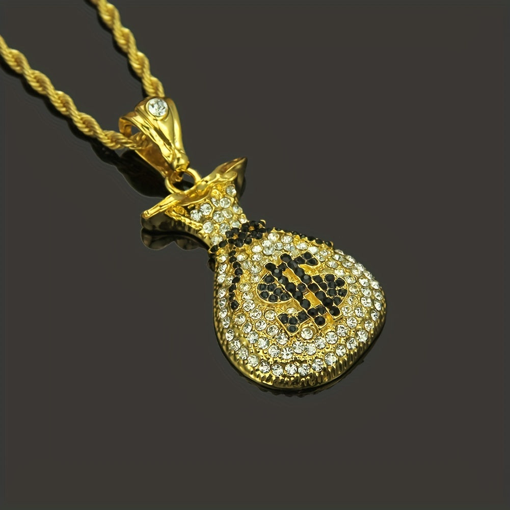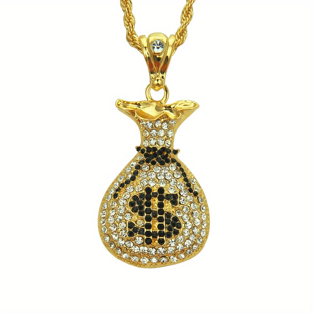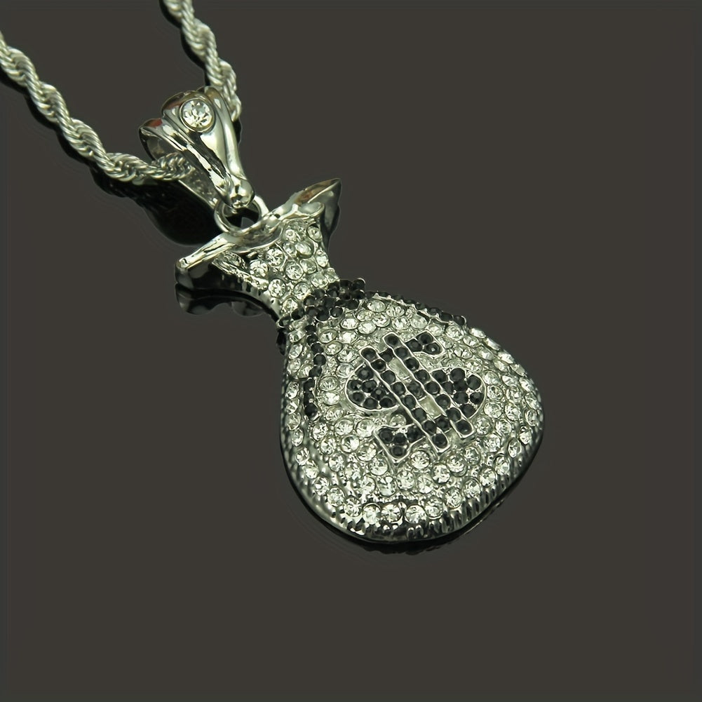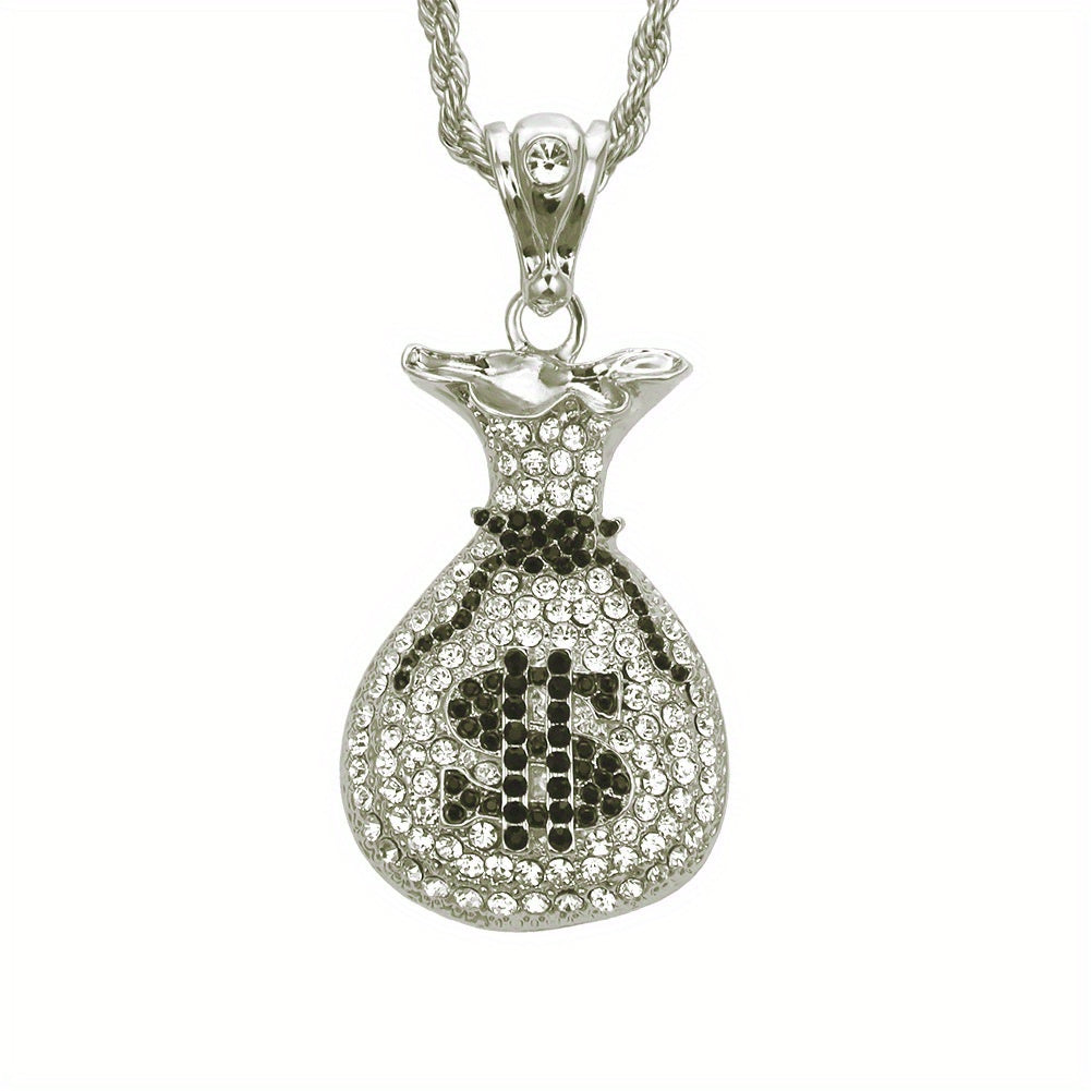 This stylish pendant necklace features a money bag design with rhinestone inlays, perfect for adding a touch of bling to your outfit.