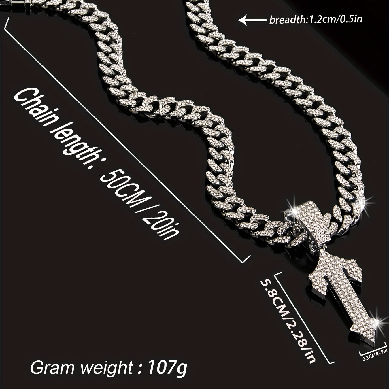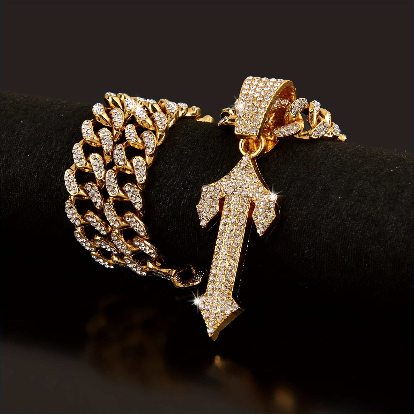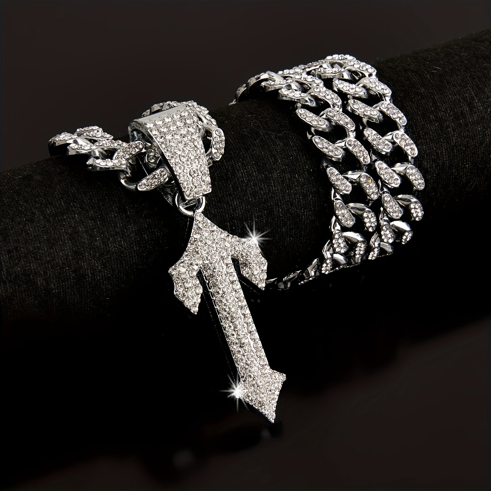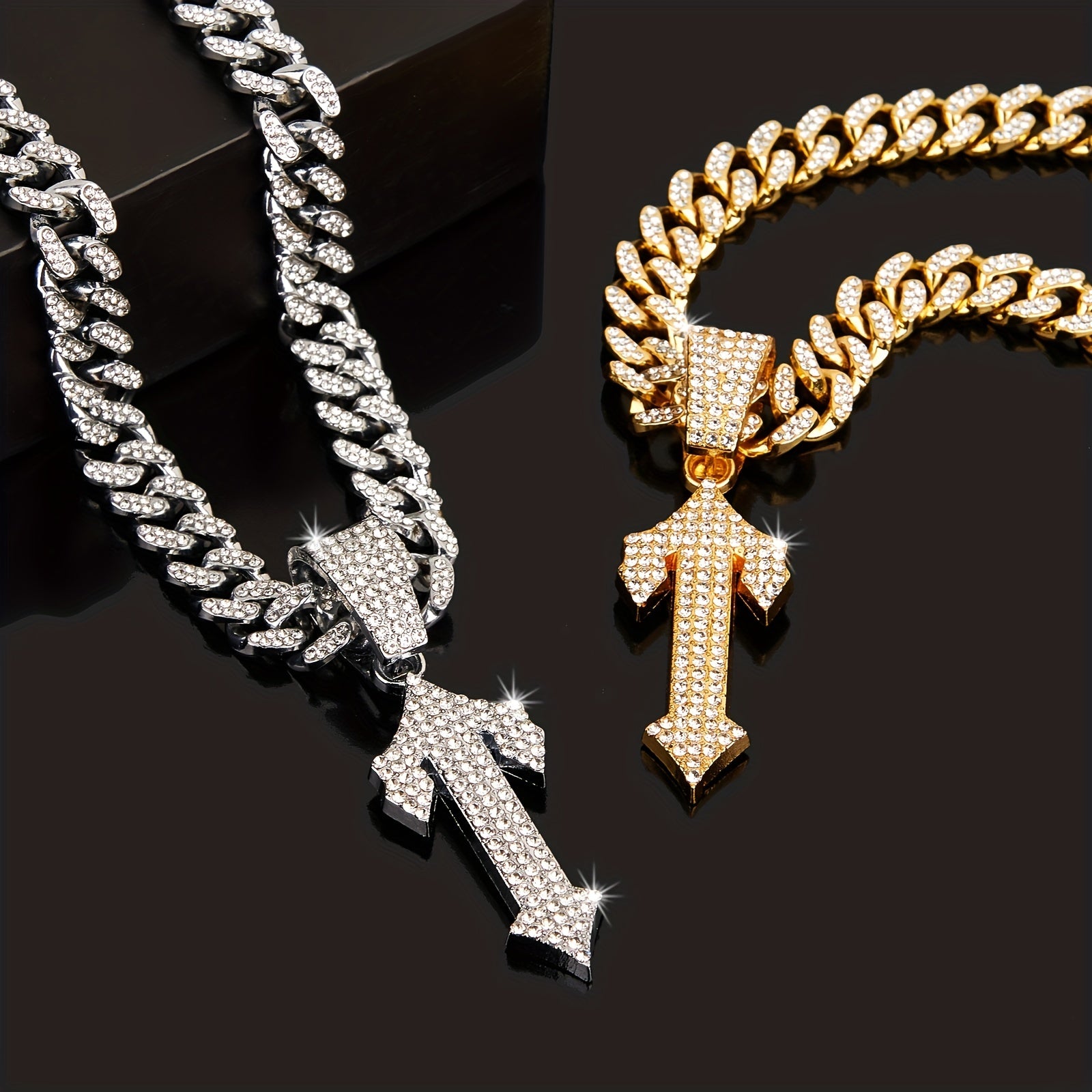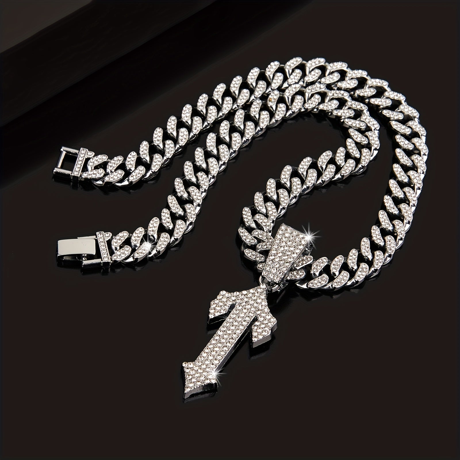 This hip hop pendant necklace features a stylish arrow design with rhinestones. It adds a cool touch to any outfit and is perfect for men who appreciate urban fashion.