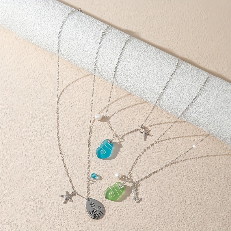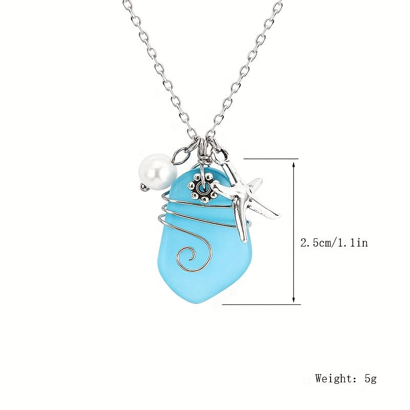 This beach ocean necklace features a sea glass pendant with a starfish and pearl accent, perfect for weddings or everyday wear.