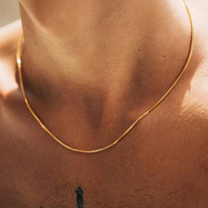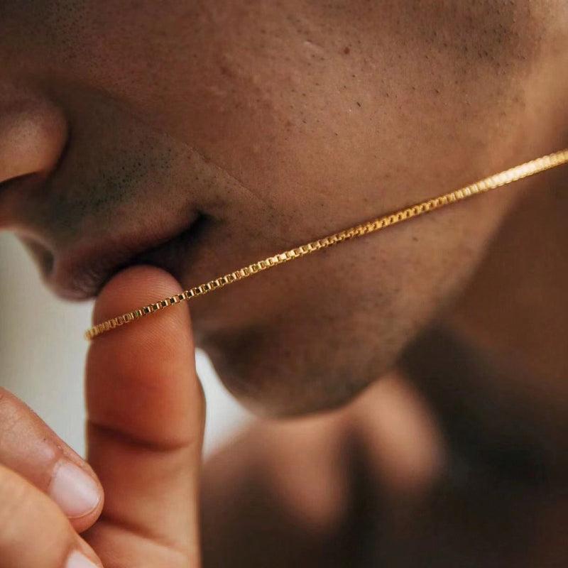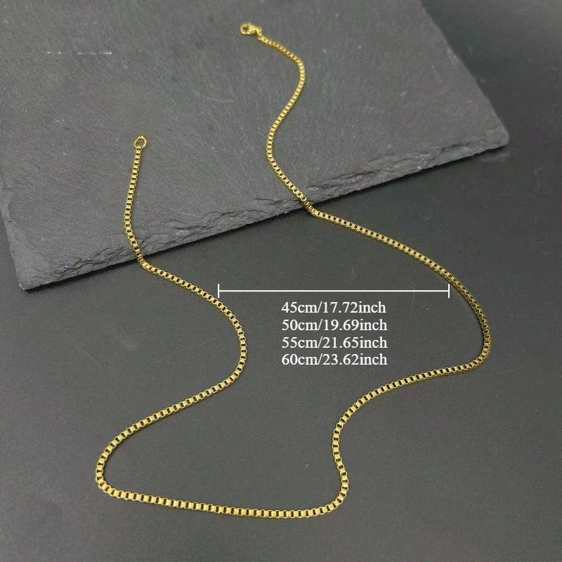 This minimalist necklace features a square box chain with a golden tone, perfect for everyday wear. It makes a great gift for your boyfriend, father, or husband.