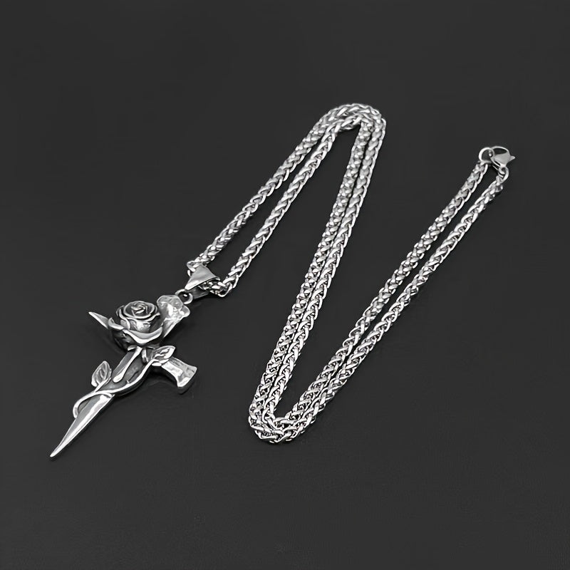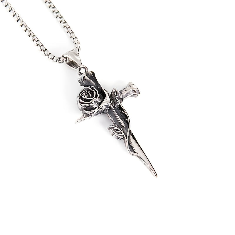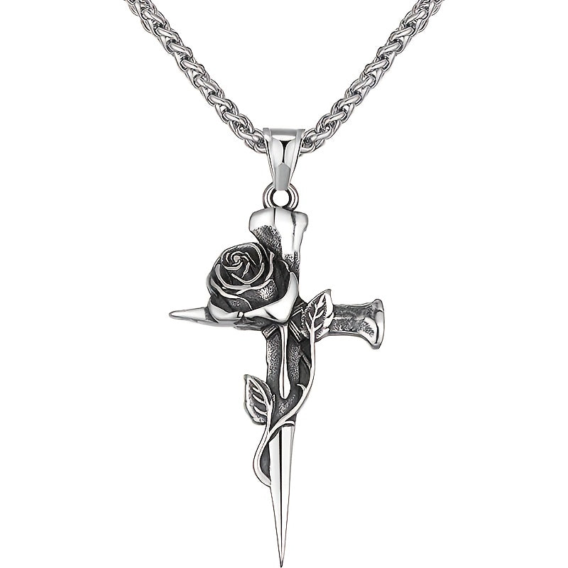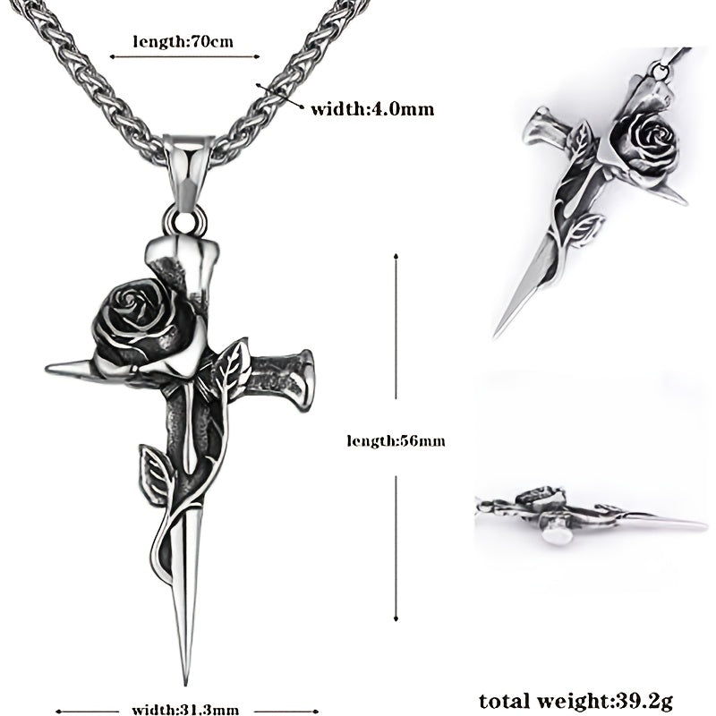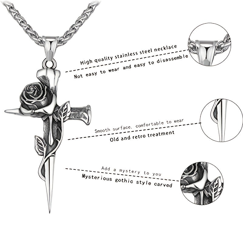 This necklace features a keel chain with a cross and rose pendant design, made of durable titanium steel. It adds a vintage touch to your outfit, perfect for casual or formal occasions.